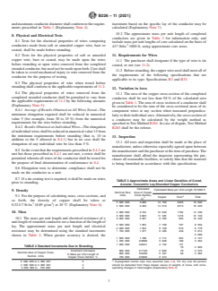 ABSTRACT This specification covers cored, annular, concentric-lay-stranded conductors made from round soft copper wires either uncoated or coated with tin for use as electrical conductors. The core may be of any materials and its size and surface firmness as a base for the overlaid wires shall be adequated to prevent forcing or dropping of any wire out of its layer position. No splice shall be made in the conductor as a whole, welds or brazes may be made in the finished individual wires. The materials shall conform to the required nominal conductor size, number of layers of wires, number, diameter, lay-up wires, approximate core diameter, and maximum conductor diameter. The mass per unit length and electrical resistance of a unit length of stranded conductor are a function of the length of lay and shall be calculated. The are of cross section of a conductor shall be considered to be the sum of the cross-sectional areas of its component wires at any section when measured perpendicularly to their individual axes. SCOPE 1.1 This specification covers cored, annular, concentric-lay-stranded conductors made from round soft copper wires, either uncoated or coated with tin for use as electrical conductors (Explanatory Note 1 and Note 2). 1.2 The constructions prescribed herein are suitable for bare conductors, or for conductors to be covered with weather-resistant (weather-proof) material, or for conductors to be insulated with rubber, varnished cloth, or impregnated paper, except types such as “oil-filled” or “gas-filled” (Explanatory Note 3). 1.3 Cored, annular conductor constructions not included in this specification shall be specifically agreed upon between the manufacturer and the purchaser when placing the order. 1.4 These constructions are not recommended for use as electric furnace leads where great flexibility is required and special conductor designs are indicated in consideration of the particular service requirements. 1.5 The SI values for density are regarded as the standard. For all other properties the inch-pound values are to be regarded as standard and the SI units may be approximate. 1.6 This international standard was developed in accordance with internationally recognized principles on standardization established in the Decision on Principles for the Development of International Standards, Guides and Recommendations issued by the World Trade Organization Technical Barriers to Trade (TBT) Committee.