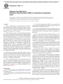 SIGNIFICANCE AND USE 5.1 This test method can be used in a number of engineering applications such as to evaluate the potential strength of subgrade, subbase, and base course materials, including recycled materials for use in the design of flexible roads and airfield pavements. Note 1: As with other laboratory test methods, the user should consider whether results from this test are appropriate for the intended design use. Considerations may include roadbed conditions, environmental conditions, soil saturation, drainage effects, seasonal effects, etc. 5.2 For applications where the effect of compaction water content on CBR is small, such as cohesionless, coarse-grained materials, or where an allowance is made for the effect of differing compaction water contents in the design procedure, the CBR may be determined at the optimum water content of a specified compaction effort. The specified dry unit weight is normally the minimum percent compaction allowed by the using client’s field compaction specification. 5.3 For applications where the effect of compaction water content on CBR is unknown or where it is desired to account for its effect, the CBR is determined for a range of water contents, usually the range of water content permitted for field compaction by using the client’s protocol or specification for field compaction. 5.4 The criteria for test specimen preparation of self-cementing (and other) materials which gain strength with time must be based on a geotechnical engineering evaluation. As directed by the client, self-cementing materials shall be properly cured until bearing ratios representing long term service conditions can be measured. Note 2: The quality of the results produced by this standard is dependent on the competence of the personnel performing it, and the suitability of the equipment and facilities used. Agencies that meet the criteria of Practice D3740 are generally considered capable of competent and objective testing/sampling/inspection/etc. Users of ... SCOPE 1.1 This test method covers the determination of the California Bearing Ratio (CBR) of laboratory compacted specimens. The test method is primarily intended for, but not limited to, evaluating the strength of materials having maximum particle size less than 3/4 in. (19 mm). 1.2 When materials having a maximum particle size greater than 3/4 in. (19 mm) are to be tested, this test method provides for modifying the gradation of the material so that the material used for testing all passes the 3/4-in. (19-mm) sieve while the total gravel fraction (material passing the 3-in. (75-mm) sieve and retained on the No. 4 (4.75-mm) sieve) remains the same. While traditionally this method of specimen preparation has been used to avoid the error inherent in testing materials containing large particles in the CBR test apparatus, the modified material may have significantly different strength properties than the original material. However, a large experience database has been developed using this test method for materials for which the gradation has been modified, and satisfactory design methods are in use based on the results of tests using this procedure. 1.3 Past practice has shown that CBR results for those materials having substantial percentages of particles retained on the No. 4 (4.75 mm) sieve are more variable than for finer materials. Consequently, more trials may be required for these materials to establish a reliable CBR. 1.4 This test method provides for the determination of the CBR of a material at optimum water content or a range of water contents from a specified compaction test and a specified dry unit weight. The dry unit weight is usually given as a percentage of maximum dry unit weight determined by Test Methods D698 or D1557. 1.4.1 The client requesting the CBR test may specify the water content or range of water contents and/or the dry unit weight for which the CBR is desired. 1.5 Unless specified oth...