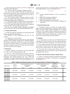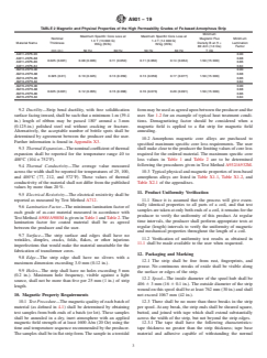 ABSTRACT This specification covers the requirements to which flat-cast, amorphous, semi-processed, iron-base magnetic core alloys must conform. These alloys shall be produced by a rapid-quenching, direct-casting process, resulting in metals with noncrystalline structure. The alloys shall be made to meet specified maximum core-loss values and shall be intended primarily for commercial power frequency applications. Desirable core-loss and permeability characteristics shall be developed by further heat treatment in a magnetic field. Amorphous magnetic core alloys are normally composed of iron with small amounts of alloying elements such as boron and silicon. There are no specific chemical requirements in this specification. Material produced to this specification shall conform to the required physical and mechanical properties such as density, ductility, thermal expansion, thermal conductivity, volume resistivity, lamination factor, surface, edge, and pinholes. The alloy shall also conform to the magnetic property requirements such as DC induction, DC coercive field strength, DC residual induction, core loss, and specific exciting power. SCOPE 1.1 This specification covers the general requirements to which flat-cast, amorphous, semi-processed, iron-base magnetic core alloys must conform. 1.2 These alloys are produced by a rapid-quenching, direct-casting process, resulting in metals with noncrystalline (amorphous) structure. The metallic alloys are made to meet specified maximum core-loss values and are intended primarily for commercial power frequency (50- and 60-Hz) applications in magnetic devices. Desirable core-loss and permeability characteristics are developed by further heat treatment in a magnetic field by the user. The heat treatment typically consists of heating the material to a temperature of 320 to 420°C in a dry, inert atmosphere for 5 to 10 min, although soak times of up to 2 h may be used for large transformer cores. A magnetic field may be required during annealing as designated by the producer. Exact optimum annealing conditions depend on the processing of the material and the size and shape of the device. 1.3 Some of these alloys are sensitive to mechanical stress. Care must be exercised in minimizing any stresses on the material in its final application, otherwise, its magnetic properties will be significantly impaired. 1.4 This specification is developed to aid in the purchase of transformer grade amorphous strip. It provides the chemical, physical, and magnetic parameters and procedures for quality control tests. 1.5 The values stated in SI units are to be regarded as standard. The values given in parentheses are numerical conversions to customary (cgs and inch-pound) units which are provided for information only and are not considered standard. 1.6 This standard does not purport to address the safety concerns associated with its use. It is the responsibility of the user of this standard to establish appropriate safety, health, and environmental practices and determine the applicability of regulatory limitations prior to use. 1.7 This international standard was developed in accordance with internationally recognized principles on standardization established in the Decision on Principles for the Development of International Standards, Guides and Recommendations issued by the World Trade Organization Technical Barriers to Trade (TBT) Committee.