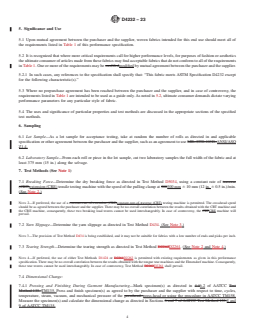 SIGNIFICANCE AND USE 5.1 Upon mutual agreement between the purchaser and the supplier, woven fabrics intended for this end use should meet all of the requirements listed in Table 1 of this performance specification. 5.2 It is recognized that where more critical requirements call for higher performance levels, for purposes of fashion or aesthetics the ultimate consumer of articles made from these fabrics may find acceptable fabrics that do not conform to all of the requirements in Table 1. One or more of the requirements may be modified by mutual agreement between the purchaser and the supplier. 5.2.1 In such cases, any references to the specification shall specify that: “This fabric meets ASTM Specification D4232 except for the following characteristic(s).” 5.3 Where no prepurchase agreement has been reached between the purchaser and the supplier, and in case of controversy, the requirements listed in Table 1 are intended to be used as a guide only. As noted in 5.2, ultimate consumer demands dictate varying performance parameters for any particular style of fabric. 5.4 The uses and significance of particular properties and test methods are discussed in the appropriate sections of the specified test methods. SCOPE 1.1 This performance specification covers the performance requirements for woven fabrics for career apparel: dress and vocational. 1.2 This performance specification is not applicable to career apparel fabrics that do not patently fit the category of Career Dress Apparel. Performance specifications for such fabrics should be as agreed to between the purchaser and the seller. This performance specification is not applicable to overcoat or topcoat uniform fabrics. 1.3 These requirements apply to both the length and width directions for those properties where fabric direction is pertinent. 1.4 This standard does not purport to address all of the safety concerns, if any, associated with its use. It is the responsibility of the user of this standard to establish appropriate safety, health, and environmental practices and determine the applicability of regulatory limitations prior to use. 1.5 This international standard was developed in accordance with internationally recognized principles on standardization established in the Decision on Principles for the Development of International Standards, Guides and Recommendations issued by the World Trade Organization Technical Barriers to Trade (TBT) Committee.