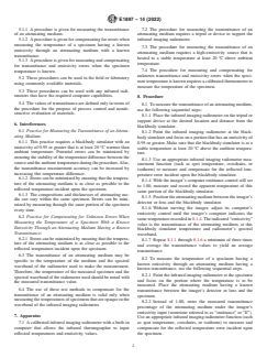 1.1 This practice covers procedures for measuring and compensating for transmittance when using an infrared imaging radiometer to measure the temperature of a specimen through an attenuating medium, such as a window, filter, or atmosphere.2