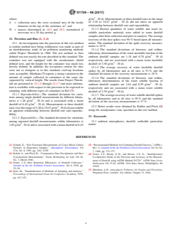 ASTM D1739-98(2017) is a standard published by ASTM International. Its full title is "Standard Test Method for Collection and Measurement of Dustfall (Settleable Particulate Matter)". This standard covers: SIGNIFICANCE AND USE 5.1 This test method has the advantage of extreme simplicity. It is a crude and non-specific test method, but it is useful in the study of long-term trends. It requires very little investment in equipment and can be carried out without a large technically-skilled staff. 5.2 This test method is useful for obtaining samples of settleable particulate matter for further chemical analysis (1).4 SCOPE 1.1 This test method covers a procedure for collection of dustfall and its measurement. This test method is not appropriate for determination of the dustfall rate in small areas affected by specific sources. This test method describes determination of both water-soluble and insoluble particulate matter. 1.2 This test method is inappropriate for industrial hygiene use except where other more specific methods are also used. 1.3 The values stated in SI units are to be regarded as standard. No other units of measurement are included in this standard. 1.4 This standard does not purport to address all of the safety concerns, if any, associated with its use. It is the responsibility of the user of this standard to establish appropriate safety and health practices and determine the applicability of regulatory limitations prior to use.