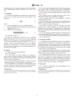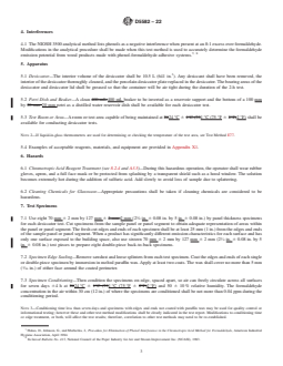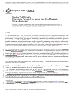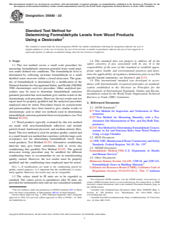 SIGNIFICANCE AND USE 3.1 Limitations have been established on formaldehyde emission levels for wood panel building products made with urea-formaldehyde adhesives and permanently installed in homes or used as components in kitchen cabinets and for similar industrial products. This test method is used in conjunction with the test method referenced by HUD Rules and Regulations 24 CFR 3280 for manufactured housing, California Air Resources Board (CARB) regulation 93120, EPA TSCA Title VI 40 CFR Section 770, and by Minnesota Statutes Section 144.495 for housing units and building materials. This test method provides a means of testing small-size samples to determine formaldehyde emission potential. 3.2 This test method incorporates a desiccator, with the desiccant removed, having a 250 mm (10 in.) inside diameter and a volume of approximately 10.5 L (641 in.3) with the desiccator lid in place. Conditions controlled in the procedure are as follows: 3.2.1 Conditioning of panel products prior to testing, 3.2.2 Specified number, size, and edge sealing of wood specimens to be placed in the desiccator, 3.2.3 Test desiccator temperature, and 3.2.4 Samples from the 25 mL distilled water collection medium in the petri dish bottom are analyzed for formaldehyde at the end of a 2-h period in the closed desiccator. 3.3 This test method employs a single set of environmental conditions to assess formaldehyde emission potential from certain wood products. When the relationship between desiccator test values and large-chamber test values are to be determined, the values for the specific wood panel product type shall be plotted. This test method does allow a comparison of formaldehyde levels from different products for the same use. 3.3.1 Care must be exercised in the extension of the results to actual formaldehyde emission from products under actual use conditions. SCOPE 1.1 This test method covers a small scale procedure for measuring formaldehyde emission potential from wood products under defined test conditions. The formaldehyde level is determined by collecting air-borne formaldehyde in a small distilled water reservoir within a closed desiccator. The quantity of formaldehyde is determined by a modification of the National Institute for Occupational Safety and Health (NIOSH) 3500 chromotropic acid test procedure. Other analytical procedures may be used to determine formaldehyde emission potential provided that such methods give similar results to the chromotropic acid procedure. However, the test results and test report must be properly qualified and the analytical procedure employed must be noted. Procedures based on acetylacetone and pararosaniline have been found to give similar results to chromotropic acid in other test methods used in determining formaldehyde emission potential from wood products (see Test Method E1333). 1.2 Wood products typically evaluated by this test method are made with urea-formaldehyde adhesives and include particle-board, hardwood plywood, and medium-density fiberboard. This test method is used for product quality control and is a small bench test method that correlates with the large-scale acceptance test for determining formaldehyde levels from wood products, Test Method E1333. Alternative conditioning intervals may give better correlation, such as seven day conditioning that parallels Test Method E1333. The general desiccator testing procedure may be modified for different conditioning times to accommodate its use in manufacturing quality control. However, the test results must be properly qualified and the conditioning time employed must be noted. Note 1: If modifications are made to the conditioning period for quality control purposes, it is important that the modification is consistently applied. Otherwise, the results may not be comparable. 1.3 The values stated in SI units are to be regarded as standard. The values given in parentheses after SI units are provide...