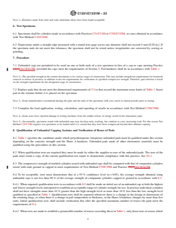 SIGNIFICANCE AND USE 4.1 This practice provides for using an unbonded capping system in testing hardened concrete cylinders made in accordance with Practices C31/C31M or C192/C192M, or cores obtained in accordance with Test Method C42/C42M in lieu of the capping systems described in Practice C617/C617M. 4.2 The elastomeric pads deform in initial loading to conform to the contour of the ends of the test specimens and are restrained from excessive lateral spreading by plates and metal rings to provide a uniform distribution of load from the bearing blocks of the testing machine to the ends of the concrete or mortar specimens. SCOPE 1.1 This practice covers requirements for a capping system using unbonded caps for testing concrete cylinders molded in accordance with Practice C31/C31M or C192/C192M, or cores obtained in accordance with Test Method C42/C42M. Unbonded neoprene caps of a defined hardness are permitted to be used for testing for a specified maximum number of reuses without qualification testing up to a certain concrete compressive strength level. Above that strength, level neoprene caps will require qualification testing. Qualification testing is required for all elastomeric materials other than neoprene regardless of the concrete strength. 1.2 Unbonded caps are not to be used for acceptance testing of concrete with compressive strength below 10 MPa [1500 psi ] or above 80 MPa [12 000 psi]. 1.3 The text of this standard refers to notes and footnotes that provide explanatory material. These notes and footnotes (excluding those in tables and figures) shall not be considered as requirements of the standard. 1.4 Units—The values stated in either SI units or inch-pound units are to be regarded separately as standard. The values stated in each system are not necessarily exact equivalents; therefore, to ensure conformance with the standard, each system shall be used independently of the other, and values from the two systems shall not be combined. Combining values from the two systems may result in non-conformance with the standard. 1.5 This standard does not purport to address all of the safety concerns, if any, associated with its use. It is the responsibility of the user of this standard to establish appropriate safety, health, and environmental practices and determine the applicability of regulatory limitations prior to use. (Warning—Concrete specimens tested with unbonded caps rupture more violently than comparable specimens tested with bonded caps. The safety precautions given in the Manual of Aggregate and Concrete Testing are recommended.2) 1.6 This international standard was developed in accordance with internationally recognized principles on standardization established in the Decision on Principles for the Development of International Standards, Guides and Recommendations issued by the World Trade Organization Technical Barriers to Trade (TBT) Committee.