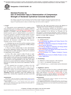 ASTM C1231/C1231M-23 is a standard published by ASTM International. Its full title is "Standard Practice for Use of Unbonded Caps in Determination of Compressive Strength of Hardened Cylindrical Concrete Specimens". This standard covers: SIGNIFICANCE AND USE 4.1 This practice provides for using an unbonded capping system in testing hardened concrete cylinders made in accordance with Practices C31/C31M or C192/C192M, or cores obtained in accordance with Test Method C42/C42M in lieu of the capping systems described in Practice C617/C617M. 4.2 The elastomeric pads deform in initial loading to conform to the contour of the ends of the test specimens and are restrained from excessive lateral spreading by plates and metal rings to provide a uniform distribution of load from the bearing blocks of the testing machine to the ends of the concrete or mortar specimens. SCOPE 1.1 This practice covers requirements for a capping system using unbonded caps for testing concrete cylinders molded in accordance with Practice C31/C31M or C192/C192M, or cores obtained in accordance with Test Method C42/C42M. Unbonded neoprene caps of a defined hardness are permitted to be used for testing for a specified maximum number of reuses without qualification testing up to a certain concrete compressive strength level. Above that strength, level neoprene caps will require qualification testing. Qualification testing is required for all elastomeric materials other than neoprene regardless of the concrete strength. 1.2 Unbonded caps are not to be used for acceptance testing of concrete with compressive strength below 10 MPa [1500 psi ] or above 80 MPa [12 000 psi]. 1.3 The text of this standard refers to notes and footnotes that provide explanatory material. These notes and footnotes (excluding those in tables and figures) shall not be considered as requirements of the standard. 1.4 Units—The values stated in either SI units or inch-pound units are to be regarded separately as standard. The values stated in each system are not necessarily exact equivalents; therefore, to ensure conformance with the standard, each system shall be used independently of the other, and values from the two systems shall not be combined. Combining values from the two systems may result in non-conformance with the standard. 1.5 This standard does not purport to address all of the safety concerns, if any, associated with its use. It is the responsibility of the user of this standard to establish appropriate safety, health, and environmental practices and determine the applicability of regulatory limitations prior to use. (Warning—Concrete specimens tested with unbonded caps rupture more violently than comparable specimens tested with bonded caps. The safety precautions given in the Manual of Aggregate and Concrete Testing are recommended.2) 1.6 This international standard was developed in accordance with internationally recognized principles on standardization established in the Decision on Principles for the Development of International Standards, Guides and Recommendations issued by the World Trade Organization Technical Barriers to Trade (TBT) Committee.