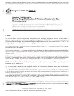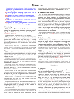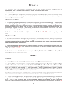 SIGNIFICANCE AND USE 5.1 The boiling range distribution of petroleum fractions provides an insight into the composition of feedstocks and products related to petroleum refining processes. The gas chromatographic simulation of this determination can be used to replace conventional distillation methods for control of refining operations. This test method can be used for product specification testing with the mutual agreement of interested parties. 5.2 Boiling range distributions obtained by this test method are essentially equivalent to those obtained by true boiling point (TBP) distillation (see Test Method D2892). They are not equivalent to results from low efficiency distillations such as those obtained with Test Method D86 or D1160. 5.3 Procedure B was tested with biodiesel mixtures and reports the Boiling Point Distribution of FAME esters of vegetable and animal origin mixed with ultra low sulfur diesel. SCOPE 1.1 This test method covers the determination of the boiling range distribution of petroleum products. The test method is applicable to petroleum products and fractions having a final boiling point of 538 °C (1000 °F) or lower at atmospheric pressure as measured by this test method. This test method is limited to samples having a boiling range greater than 55.5 °C (100 °F), and having a vapor pressure sufficiently low to permit sampling at ambient temperature. Note 1: Since a boiling range is the difference between two temperatures, only the constant of 1.8 °F/°C is used in the conversion of the temperature range from one system of units to another. 1.1.1 Procedure A (Sections 6 – 14)—Allows a larger selection of columns and analysis conditions such as packed and capillary columns as well as a Thermal Conductivity Detector in addition to the Flame Ionization Detector. Analysis times range from 14 min to 60 min. 1.1.2 Procedure B (Sections 15 – 23)—Is restricted to only 3 capillary columns and requires no sample dilution. In addition, Procedure B is used not only for the sample types described in Procedure A but also for the analysis of samples containing biodiesel mixtures B5, B10, and B20. The analysis time, when using Procedure B (Accelerated D2887), is reduced to about 8 min. 1.2 This test method is not to be used for the analysis of gasoline samples or gasoline components. These types of samples must be analyzed by Test Method D7096. 1.3 The values stated in SI units are to be regarded as standard. The values given in parentheses after SI units are provided for information only and are not considered standard. 1.4 This standard does not purport to address all of the safety concerns, if any, associated with its use. It is the responsibility of the user of this standard to establish appropriate safety, health, and environmental practices and determine the applicability of regulatory limitations prior to use. 1.5 This international standard was developed in accordance with internationally recognized principles on standardization established in the Decision on Principles for the Development of International Standards, Guides and Recommendations issued by the World Trade Organization Technical Barriers to Trade (TBT) Committee.