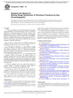 ASTM D2887-23 is a standard published by ASTM International. Its full title is "Standard Test Method for Boiling Range Distribution of Petroleum Fractions by Gas Chromatography". This standard covers: SIGNIFICANCE AND USE 5.1 The boiling range distribution of petroleum fractions provides an insight into the composition of feedstocks and products related to petroleum refining processes. The gas chromatographic simulation of this determination can be used to replace conventional distillation methods for control of refining operations. This test method can be used for product specification testing with the mutual agreement of interested parties. 5.2 Boiling range distributions obtained by this test method are essentially equivalent to those obtained by true boiling point (TBP) distillation (see Test Method D2892). They are not equivalent to results from low efficiency distillations such as those obtained with Test Method D86 or D1160. 5.3 Procedure B was tested with biodiesel mixtures and reports the Boiling Point Distribution of FAME esters of vegetable and animal origin mixed with ultra low sulfur diesel. SCOPE 1.1 This test method covers the determination of the boiling range distribution of petroleum products. The test method is applicable to petroleum products and fractions having a final boiling point of 538 °C (1000 °F) or lower at atmospheric pressure as measured by this test method. This test method is limited to samples having a boiling range greater than 55.5 °C (100 °F), and having a vapor pressure sufficiently low to permit sampling at ambient temperature. Note 1: Since a boiling range is the difference between two temperatures, only the constant of 1.8 °F/°C is used in the conversion of the temperature range from one system of units to another. 1.1.1 Procedure A (Sections 6 – 14)—Allows a larger selection of columns and analysis conditions such as packed and capillary columns as well as a Thermal Conductivity Detector in addition to the Flame Ionization Detector. Analysis times range from 14 min to 60 min. 1.1.2 Procedure B (Sections 15 – 23)—Is restricted to only 3 capillary columns and requires no sample dilution. In addition, Procedure B is used not only for the sample types described in Procedure A but also for the analysis of samples containing biodiesel mixtures B5, B10, and B20. The analysis time, when using Procedure B (Accelerated D2887), is reduced to about 8 min. 1.2 This test method is not to be used for the analysis of gasoline samples or gasoline components. These types of samples must be analyzed by Test Method D7096. 1.3 The values stated in SI units are to be regarded as standard. The values given in parentheses after SI units are provided for information only and are not considered standard. 1.4 This standard does not purport to address all of the safety concerns, if any, associated with its use. It is the responsibility of the user of this standard to establish appropriate safety, health, and environmental practices and determine the applicability of regulatory limitations prior to use. 1.5 This international standard was developed in accordance with internationally recognized principles on standardization established in the Decision on Principles for the Development of International Standards, Guides and Recommendations issued by the World Trade Organization Technical Barriers to Trade (TBT) Committee.