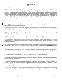 SIGNIFICANCE AND USE 5.1 Protection of a species requires the prevention of detrimental effects of chemicals on the survival, growth, reproduction, and health of that species. Behavioral toxicity provides information concerning sublethal effects of chemicals and signals the presence of toxic test substances. 5.1.1 The behavioral responses of all organisms are adaptive and essential to survival. Major changes in the behavioral responses of fish, amphibians, and macroinvertebrates may result in a diminished ability to survive, grow, or reproduce and cause significant changes in the natural population (8). 5.2 The results from behavioral toxicity tests may be useful for measuring injury in the assessment of damages resulting from the release of hazardous materials (9) . 5.3 Behavioral toxicity test methods may be useful for long-term monitoring of effluents (10) . 5.4 The results from behavioral toxicity data can be used to predict the effects of exposure on fish, amphibians, and aquatic invertebrates likely to occur in field situations as a result of exposure under similar conditions, including the avoidance of exposure by motile organisms (11). 5.5 The results from behavioral toxicity tests might be an important consideration for assessing the hazard of materials to aquatic organisms. Such results might also be used when deriving water quality criteria for fish and aquatic invertebrate organisms. 5.6 The results from behavioral toxicity tests can be used to compare the sensitivities of different species, relative toxicity of different chemical substances on the same organism, or effect of various environmental variables on the toxicity of a chemical substance. 5.7 The results from behavioral toxicity tests can be used to predict the effects of long-term exposure. 5.8 The results of behavioral toxicity tests can be useful for guiding decisions regarding the extent of remedial action needed for contaminated aquatic and terrestrial sites. 5.9 The behavioral charac... SCOPE 1.1 This guide covers some general information on the selection and application of behavioral methods useful for determining the sublethal effects of chemicals to fish, amphibians, and macroinvertebrates. 1.2 Behavioral toxicity occurs when chemical or other stressful conditions, such as changes in water quality or temperature, induce a behavioral change that exceeds the normal range of variability (1).2 Behavior includes all observable, recordable, or measurable activities of a living organism and reflects genetic, neurobiological, physiological, and environmental determinants (2). 1.3 Behavioral methods can be used in biomonitoring, the determination of no-observed-effect and lowest-observed-effect concentrations, and the prediction of hazardous chemical impacts on natural populations (3). 1.4 Behavioral methods can be applied to fish, amphibians, and macroinvertebrates in standard laboratory toxicity tests, tests of effluents, and sediment toxicity tests. 1.5 The various behavioral methods included in this guide are categorized with respect to seven interdependent, functional responses that fish, amphibians, and macroinvertebrates must perform in order to survive. These functional responses include respiration, locomotion, habitat selection, feeding, predator avoidance, competition, and reproduction (4). These responses can be documented visually or through video or acoustic imagery. Electronically recorded information can be derived through manual techniques or through the use of digital image analysis software (5, 6, 7). 1.5.1 The functional responses are not necessarily mutually exclusive categories. For instance, locomotion, of some form of movement, is important to all behavioral functions. 1.6 Additional behavioral methods for any category may be added when new tests are developed as well as when methods are adapted to different species or different life stages of an organism. 1.7 This gui...