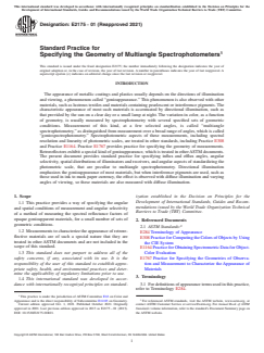ASTM E2175-01(2021) is a standard published by ASTM International. Its full title is "Standard Practice for Specifying the Geometry of Multiangle Spectrophotometers". This standard covers: SIGNIFICANCE AND USE 4.1 This practice is for the use of manufacturers and users of instruments to measure the appearance of gonioapparent materials, those writing standard specifications for such instruments, and others who wish to specify precisely the geometric conditions of multiangle spectrophotometry. A prominent example of industrial usage is the routine application of such measurements by material suppliers and automobile manufacturers to measure the colors of metallic paints and plastics. SCOPE 1.1 This practice provides a way of specifying the angular and spatial conditions of measurement and angular selectivity of a method of measuring the spectral reflectance factors of opaque gonioapparent materials, for a small number of sets of geometric conditions. 1.2 Measurements to characterize the appearance of retroreflective materials are of such a special nature that they are treated in other ASTM documents and are not included in the scope of this standard. 1.3 This standard does not purport to address all of the safety concerns, if any, associated with its use. It is the responsibility of the user of this standard to establish appropriate safety, health, and environmental practices and determine the applicability of regulatory limitations prior to use. 1.4 This international standard was developed in accordance with internationally recognized principles on standardization established in the Decision on Principles for the Development of International Standards, Guides and Recommendations issued by the World Trade Organization Technical Barriers to Trade (TBT) Committee.