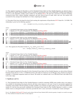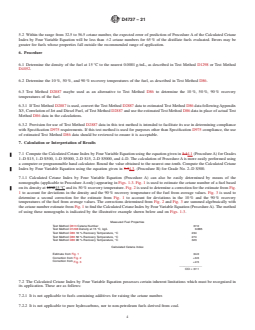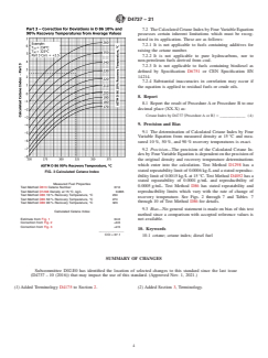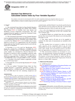 1.1 The calculated Cetane Index by Four Variable Equation provides a means for estimating the ASTM cetane number (Test Method D613) of distillate fuels from density and distillation recovery temperature measurements. The value computed from the equation is termed the Calculated Cetane Index by Four Variable Equation.