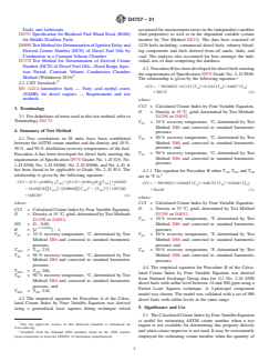 SIGNIFICANCE AND USE 5.1 The Calculated Cetane Index by Four Variable Equation is useful for estimating ASTM cetane number when a test engine is not available for determining this property directly and when cetane improver is not used. It may be conveniently employed for estimating cetane number when the quantity of sample available is too small for an engine rating. In cases where the ASTM cetane number of a fuel has been previously established, the Calculated Cetane Index by Four Variable Equation is useful as a cetane number check on subsequent batches of that fuel, provided the fuel's source and mode of manufacture remain unchanged. Note 2: Test Methods D6890 and D7170 may be used to obtain a Derived Cetane Number (DCN) when the quantity of sample is too small for an engine test. These methods do measure the effect of cetane improver. 5.2 Within the range from 32.5 to 56.5 cetane number, the expected error of prediction of Procedure A of the Calculated Cetane Index by Four Variable Equation will be less than ±2 cetane numbers for 65 % of the distillate fuels evaluated. Errors may be greater for fuels whose properties fall outside the recommended range of application. SCOPE 1.1 The calculated Cetane Index by Four Variable Equation provides a means for estimating the ASTM cetane number (Test Method D613) of distillate fuels from density and distillation recovery temperature measurements. The value computed from the equation is termed the Calculated Cetane Index by Four Variable Equation. 1.2 The Calculated Cetane Index by Four Variable Equation is not an optional method for expressing ASTM cetane number. It is a supplementary tool for estimating cetane number when a result by Test Method D613 is not available and if cetane improver is not used. As a supplementary tool, the Calculated Cetane Index by Four Variable equation must be used with due regard for its limitations. 1.3 Procedure A is to be used for Specification D975, Grades No. 1–D S15, No. 1–D S500, No. 1–D S5000, No. 2–D S15, No. 2–D S5000, and No. 4–D. This method for estimating cetane number was developed by Chevron Research Co.2 Procedure A is based on a data set including a relatively small number of No. 1–D fuels. Test Method D4737 Procedure A may be less applicable to No. 1–D S15, No. 1–D S500, and No. 1–D S5000 than to No. 2–D grade S5000 or to No. 4–D fuels. 1.3.1 Procedure A has been verified as applicable to Grade No. 2–D S15 diesel fuels.3 1.4 Procedure B is to be used for Specification D975, Grade No. 2–D S500. 1.5 The test method “Calculated Cetane Index by Four Variable Equation” is particularly applicable to Grade 1–D S5000, Grade No. 1–D S500, Grade No. 2–D S5000 and Grade No. 2–D S500 diesel fuel oils containing straight-run and cracked stocks, and their blends. It can also be used for heavier fuels with 90 % recovery points less than 382 °C and for fuels containing derivatives from oil sands and oil shale. Note 1: Sxx is the designation for maximum sulfur level specified for the grade. For example, S500 grades are those with a maximum sulfur limit of 500 ppm (μg/g). 1.6 Biodiesel blends are excluded from this test method, because they were not part of the datasets use to develop either Procedure A or B. 1.7 The values stated in SI units are to be regarded as standard. No other units of measurement are included in this standard. 1.8 This standard does not purport to address all of the safety concerns, if any, associated with its use. It is the responsibility of the user of this standard to establish appropriate safety, health, and environmental practices and determine the applicability of regulatory limitations prior to use. 1.9 This international standard was developed in accordance with internationally recognized principles on standardization established in the Decision on Principles for the Development of International Standards, Guides and Recommendations issued by the World Trade Organization Te...