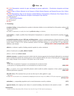 SCOPE 1.1 This terminology is a compilation of definitions of technical terms used in the plastic piping industry. Terms that are generally understood or adequately defined in other readily available sources are not included. 1.2 When a term is used in an ASTM document for which Committee F17 is responsible it is included only when judged, after review, by Subcommittee F17.91 to be a generally usable term. 1.3 Definitions that are identical to those published by other ASTM committees or other standards organizations are identified with the committee number (for example, D20) or with the abbreviation of the name of the organization (for example, IUPAC International Union of Pure and Applied Chemistry). 1.4 A definition is a single sentence with additional information included in notes. 1.5 Definitions are followed by the committee responsible for the standard(s) (for example, [F17.26]) and standard numbers(s) in which they are used (for example, F714). 1.6 Abbreviated Terminology: 1.6.1 Abbreviated terminology is intended to provide uniform contractions of terms relating to plastic piping that have evolved through widespread common usage. The compilation in this standard has been prepared to avoid the occurrence of more than one abbreviated term for a given plastics piping term and to avoid multiple meanings for abbreviated terms. 1.6.2 The abbreviated terminology and descriptions in this standard are intended to be consistent with usage in plastics piping and the standards under F17 jurisdiction. Other ASTM Committees may assign a different word-phrase description to the same abbreviated terminology. In such cases, the abbreviated terms in this standard shall apply to usage in F17 standards, or if widespread misunderstanding could result from conflicting abbreviated terminology descriptions, the abbreviated terminology for the word-phrase shall not be used in F17 standards. 1.6.3 Acronyms and Initialisms—A word formed from the letters or parts of words of a longer word-phrase, usually from the initial letters or parts of the words. An Acronym is pronounced as a word, for example radar, for radio detection and ranging. An Initialism is pronounced as a series of letters, for example DOT for Department of Transportation. 1.6.4 The Acronym or Initialism description is the origin word-phrase for the Acronym or Initialism, not a definition. 1.7 This international standard was developed in accordance with internationally recognized principles on standardization established in the Decision on Principles for the Development of International Standards, Guides and Recommendations issued by the World Trade Organization Technical Barriers to Trade (TBT) Committee.