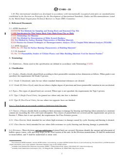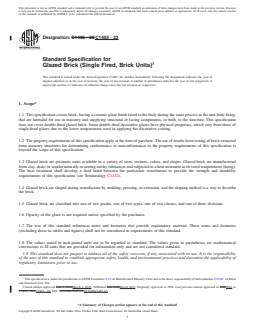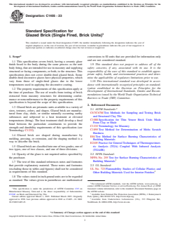 ASTM C1405-23 is a technical specification published by ASTM International. Its full title is "Standard Specification for Glazed Brick (Single Fired, Brick Units)". This standard covers: ABSTRACT This specification deals with the standards for bricks, having a ceramic glaze finish fused to the body during the same process as the unit body firing, that are intended for use in masonry. These products are also proposed for use in supplying structural or facing components. This specification, however, doest not cover double-fired glazed brick. The bricks shall be available in two grades: grade S (standard) and grade SS (select sized). Two types and classes of bricks are also covered: type I (single-faced units) and type II (two-faced units); and class exterior and class interior. The glazed bricks shall also conform to the physical properties such as durability, strength and absorption requirements and freezing and thawing requirements. SCOPE 1.1 This specification covers brick, having a ceramic glaze finish fused to the body during the same process as the unit body firing, that are intended for use in masonry and supplying structural or facing components, or both, to the structure. This specification does not cover double-fired glazed brick. Some double-fired decorative glazes have physical properties, which vary from those of single-fired glazes due to the lower temperatures used in applying the decorative coating. 1.2 The property requirements of this specification apply at the time of purchase. The use of results from testing of brick extracted from masonry structures for determining conformance or nonconformance to the property requirements of this specification is beyond the scope of this specification. 1.3 Glazed brick are prismatic units available in a variety of sizes, textures, colors, and shapes. Glazed brick are manufactured from clay, shale, or similar naturally occurring earthy substances and subjected to a heat treatment at elevated temperatures (firing). The heat treatment shall develop a fired bond between the particulate constituents to provide the strength and durability requirements of this specification (see Terminology C1232). 1.4 Glazed brick are shaped during manufacture by molding, pressing, or extrusion, and the shaping method is a way to describe the brick. 1.5 Glazed brick are classified into one of two grades, one of two types, one of two classes, and one of three divisions. 1.6 Opacity of the glaze is not required unless specified by the purchaser. 1.7 The text of this standard references notes and footnotes that provide explanatory material. These notes and footnotes (excluding those in tables and figures) shall not be considered as requirements of this standard. 1.8 The values stated in inch-pound units are to be regarded as standard. The values given in parentheses are mathematical conversions to SI units that are provided for information only and are not considered standard. 1.9 This standard does not purport to address all of the safety concerns, if any, associated with its use. It is the responsibility of the user of this standard to establish appropriate safety, health, and environmental practices and determine the applicability of regulatory limitations prior to use. 1.10 This international standard was developed in accordance with internationally recognized principles on standardization established in the Decision on Principles for the Development of International Standards, Guides and Recommendations issued by the World Trade Organization Technical Barriers to Trade (TBT) Committee.