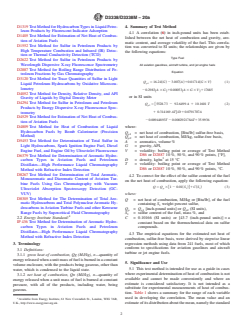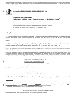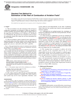 The test method covers the estimation of the net heat of combustion in both SI units (megajoules per kilogram) and inch-pound units (Btu per pound) and is relevant to fuels such as Jet A, Jet A-1, Jet B, JP-4, JP-5, JP-7, JP-8, as well as aviation gasolines of grades 100/130 and 115/145. While primarily designed for aviation fuels, the method’s correlation may also apply to similar hydrocarbon distillates.