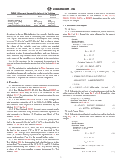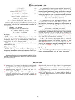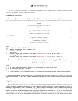 SIGNIFICANCE AND USE 5.1 This test method is intended for use as a guide in cases where experimental determination of heat of combustion is not available and cannot be made conveniently and where an estimate is considered satisfactory. It is not intended as a substitute for experimental measurements of heat of combustion. Table 1 shows a summary for the range of each variable used in developing the correlation. The mean value and an estimate of its distribution about the mean, namely the standard deviation, is shown. This indicates, for example, that the mean density for all fuels used in developing the correlation was 779.3 kg/m3 and that two thirds of the samples had a density between 721.4 kg/m3 and 837.1 kg/m3, that is, plus or minus one standard deviation. The correlation is most accurate when the values of the variables used are within one standard deviation of the mean, but is useful up to two standard deviations of the mean. The use of this correlation may be applicable to other hydrocarbon distillates and pure hydrocarbons; however, only limited data on non-aviation fuels over the entire range of the variables were included in the correlation. Note 4: The procedures for the experimental determination of the gross and net heats of combustion are described in Test Methods D240 and D4809. 5.2 The calorimetric methods cited in Note 4 measure gross heat of combustion. However, net heat is used in aircraft calculations because all combustion products are in the gaseous state. This calculation method is based on net heat, but a correction is required for condensed sulfur compounds. SCOPE 1.1 This test method covers the estimation of the net heat of combustion (megajoules per kilogram or [Btu per pound]) of aviation gasolines and aircraft turbine and jet engine fuels in the range from 40.19 MJ/kg to 44.73 MJ/kg or [17 280 Btu/lb to 19 230 Btu/lb]. The precision for estimation of the net heat of combustion outside this range has not been determined for this test method. 1.2 This test method is purely empirical and is applicable to liquid hydrocarbon fuels that conform to the specifications for aviation gasolines or aircraft turbine and jet engine fuels of grades Jet A, Jet A-1, Jet B, JP-4, JP-5, JP-7, and JP-8. Note 1: The experimental data on heat of combustion from which the Test Method D3338 correlation was devised was obtained by a precision method similar to Test Method D4809. Note 2: The estimation of the net heat of combustion of a hydrocarbon fuel is justifiable only when the fuel belongs to a well-defined class for which a relation between heat of combustion and aromatic and sulfur contents, density, and distillation range of the fuel has been derived from accurate experimental measurements on representative samples of that class. Even in this case, the possibility that the estimates may be in error by large amounts for individual fuels should be recognized. The fuels used to establish the correlation presented in this method are defined as follows: Fuels: Aviation gasoline—Grades 100/130 and 115/145 (1, 2)2 Kerosenes, alkylates, and special WADC fuels (3) Pure hydrocarbons—paraffins, naphthenes, and aromatics (4) Fuels for which data were reported by the Coordinating Research Council (5). Note 3: The property ranges used in this correlation are as follows: Aromatics—from 0 % by mass to 100 % by mass API Gravity—from [25.7° to 81.2°API] Volatility—from [160 °F to 540 °F], average boiling point 1.3 The values stated in either SI units or inch-pound units are to be regarded separately as standard. The values stated in each system may not be exact equivalents; therefore, each system shall be used independently of the other. Combining values from the two systems may result in non-conformance with the standard. 1.3.1 Although the test method permits the calculation of net heat of combustion in either SI or inch-pound units, SI units are the preferred...