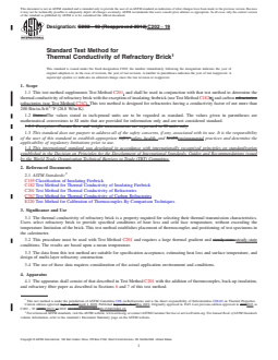 1.1 This test method supplements Test Method C201, and shall be used in conjunction with that test method to determine the thermal conductivity of refractory brick with the exception of insulating firebrick (use Test Method C182) and carbon refractories (use Test Method C767). This test method is designed for refractories having a conductivity factor of not more than 200 Btu·in./h·ft2·°F (28.8 W/m·K).