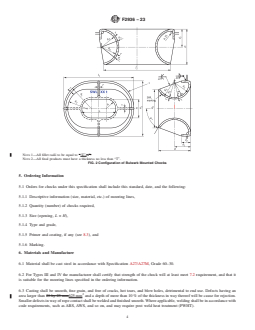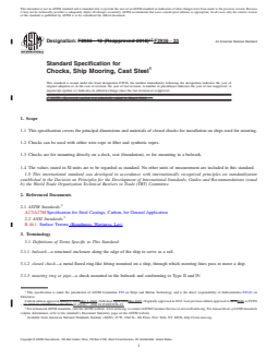 ABSTRACT This specification covers the principal dimensions and materials of closed chocks for installation on ships used for mooring. It specifies the classification of chocks, their dimension requirements, and strength requirements. It also demonstrates the proper horizontal and vertical loading for Type A and Type B chocks. SCOPE 1.1 This specification covers the principal dimensions and materials of closed chocks for installation on ships used for mooring. 1.2 Chocks can be used with either wire rope or fiber and synthetic ropes. 1.3 Chocks are for mounting directly on a deck, seat (foundation), or for mounting in a bulwark. 1.4 The values stated in SI units are to be regarded as standard. No other units of measurement are included in this standard. 1.5 This international standard was developed in accordance with internationally recognized principles on standardization established in the Decision on Principles for the Development of International Standards, Guides and Recommendations issued by the World Trade Organization Technical Barriers to Trade (TBT) Committee.