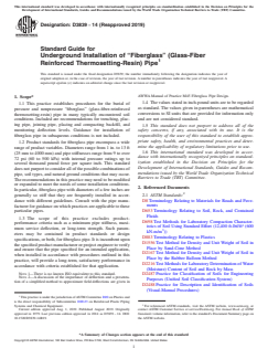 ASTM D3839-14(2019) is a guide published by ASTM International. Its full title is "Standard Guide for Underground Installation of “Fiberglass” (Glass-Fiber Reinforced Thermosetting-Resin) Pipe". This standard covers: SIGNIFICANCE AND USE 4.1 This practice is for use by designers and specifiers, manufacturers, installation contractors, regulatory agencies, owners, and inspection organizations involved in the construction of buried fiberglass pipelines. As with any practice, modifications may be required for specific job conditions, or for special local or regional conditions. Recommendations for inclusion of this practice in contract documents for a specific project are given in Appendix X1. SCOPE 1.1 This practice establishes procedures for the burial of pressure and nonpressure “fiberglass” (glass-fiber-reinforced thermosetting-resin) pipe in many typically encountered soil conditions. Included are recommendations for trenching, placing pipe, joining pipe, placing and compacting backfill, and monitoring deflection levels. Guidance for installation of fiberglass pipe in subaqueous conditions is not included. 1.2 Product standards for fiberglass pipe encompass a wide range of product variables. Diameters range from 1 in. to 13 ft (25 mm to 4000 mm) and pipe stiffnesses range from 9 to over 72 psi (60 to 500 kPa) with internal pressure ratings up to several thousand pound force per square inch. This standard does not purport to consider all of the possible combinations of pipe, soil types, and natural ground conditions that may occur. The recommendations in this practice may need to be modified or expanded to meet the needs of some installation conditions. In particular, fiberglass pipe with diameters of a few inches are generally so stiff that they are frequently installed in accordance with different guidelines. Consult with the pipe manufacturer for guidance on which practices are applicable to these particular pipes. 1.3 The scope of this practice excludes product-performance criteria such as a minimum pipe stiffness, maximum service deflection, or long-term strength. Such parameters may be contained in product standards or design specifications, or both, for fiberglass pipe. It is incumbent upon the specified product manufacturer or project engineer to verify and ensure that the pipe specified for an intended application, when installed in accordance with procedures outlined in this practice, will provide a long-term, satisfactory performance in accordance with criteria established for that application. Note 1: There is no known ISO equivalent to this standard. Note 2: A discussion of the importance of deflection and a presentation of a simplified method to approximate field deflections are given in AWWA Manual of Practice M45 Fiberglass Pipe Design. 1.4 The values stated in inch-pound units are to be regarded as standard. The values given in parentheses are mathematical conversions to SI units that are provided for information only and are not considered standard. 1.5 This standard does not purport to address all of the safety concerns, if any, associated with its use. It is the responsibility of the user of this standard to establish appropriate safety, health, and environmental practices and determine the applicability of regulatory limitations prior to use. 1.6 This international standard was developed in accordance with internationally recognized principles on standardization established in the Decision on Principles for the Development of International Standards, Guides and Recommendations issued by the World Trade Organization Technical Barriers to Trade (TBT) Committee.