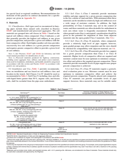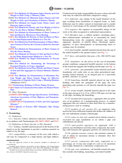 SIGNIFICANCE AND USE 4.1 This practice is for use by designers and specifiers, manufacturers, installation contractors, regulatory agencies, owners, and inspection organizations involved in the construction of buried fiberglass pipelines. As with any practice, modifications may be required for specific job conditions, or for special local or regional conditions. Recommendations for inclusion of this practice in contract documents for a specific project are given in Appendix X1. SCOPE 1.1 This practice establishes procedures for the burial of pressure and nonpressure “fiberglass” (glass-fiber-reinforced thermosetting-resin) pipe in many typically encountered soil conditions. Included are recommendations for trenching, placing pipe, joining pipe, placing and compacting backfill, and monitoring deflection levels. Guidance for installation of fiberglass pipe in subaqueous conditions is not included. 1.2 Product standards for fiberglass pipe encompass a wide range of product variables. Diameters range from 1 in. to 13 ft (25 mm to 4000 mm) and pipe stiffnesses range from 9 to over 72 psi (60 to 500 kPa) with internal pressure ratings up to several thousand pound force per square inch. This standard does not purport to consider all of the possible combinations of pipe, soil types, and natural ground conditions that may occur. The recommendations in this practice may need to be modified or expanded to meet the needs of some installation conditions. In particular, fiberglass pipe with diameters of a few inches are generally so stiff that they are frequently installed in accordance with different guidelines. Consult with the pipe manufacturer for guidance on which practices are applicable to these particular pipes. 1.3 The scope of this practice excludes product-performance criteria such as a minimum pipe stiffness, maximum service deflection, or long-term strength. Such parameters may be contained in product standards or design specifications, or both, for fiberglass pipe. It is incumbent upon the specified product manufacturer or project engineer to verify and ensure that the pipe specified for an intended application, when installed in accordance with procedures outlined in this practice, will provide a long-term, satisfactory performance in accordance with criteria established for that application. Note 1: There is no known ISO equivalent to this standard. Note 2: A discussion of the importance of deflection and a presentation of a simplified method to approximate field deflections are given in AWWA Manual of Practice M45 Fiberglass Pipe Design. 1.4 The values stated in inch-pound units are to be regarded as standard. The values given in parentheses are mathematical conversions to SI units that are provided for information only and are not considered standard. 1.5 This standard does not purport to address all of the safety concerns, if any, associated with its use. It is the responsibility of the user of this standard to establish appropriate safety, health, and environmental practices and determine the applicability of regulatory limitations prior to use. 1.6 This international standard was developed in accordance with internationally recognized principles on standardization established in the Decision on Principles for the Development of International Standards, Guides and Recommendations issued by the World Trade Organization Technical Barriers to Trade (TBT) Committee.