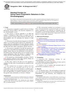 ASTM E840-95(2021)e1 is a standard published by ASTM International. Its full title is "Standard Practice for Using Flame Photometric Detectors in Gas Chromatography". This standard covers: ABSTRACT This practice is intended as a guide for the use of a flame photometric detector (FPD) as the detection component of a gas chromatographic system. The different principles of flame photometric detectors, and detector construction are presented in details. The detector sensitivity, minimum detectability, dynamic range, power law of sulphur response, linear range-phosphorus mode, unipower response range, noise and drift, and specificity are presented in details. The photomultiplier dark current is the magnitude of the FPD output signal measured with the FPD flame off. Flame background current is the difference in FPD output signal with the flame on and with the flame off in the absence of phosphorus or sulfur compounds in the flame. SCOPE 1.1 This practice is intended as a guide for the use of a flame photometric detector (FPD) as the detection component of a gas chromatographic system. 1.2 This practice is directly applicable to an FPD that employs a hydrogen-air flame burner, an optical filter for selective spectral viewing of light emitted by the flame, and a photomultiplier tube for measuring the intensity of light emitted. 1.3 This practice describes the most frequent use of the FPD which is as an element-specific detector for compounds containing sulfur (S) or phosphorus (P) atoms. However, nomenclature described in this practice are also applicable to uses of the FPD other than sulfur or phosphorus specific detection. 1.4 This practice is intended to describe the operation and performance of the FPD itself independently of the chromatographic column. However, the performance of the detector is described in terms which the analyst can use to predict overall system performance when the detector is coupled to the column and other chromatographic system components. 1.5 For general gas chromatographic procedures, Practice E260 should be followed except where specific changes are recommended herein for use of an FPD. 1.6 The values stated in SI units are to be regarded as standard. No other units of measurement are included in this standard. 1.7 This standard does not purport to address all of the safety concerns, if any, associated with its use. It is the responsibility of the user of this standard to establish appropriate safety, health, and environmental practices and determine the applicability of regulatory limitations prior to use. For specific safety information, see Section 4, Hazards. 1.8 This international standard was developed in accordance with internationally recognized principles on standardization established in the Decision on Principles for the Development of International Standards, Guides and Recommendations issued by the World Trade Organization Technical Barriers to Trade (TBT) Committee.