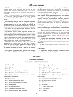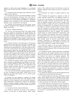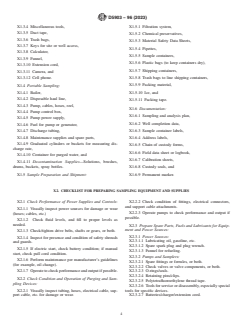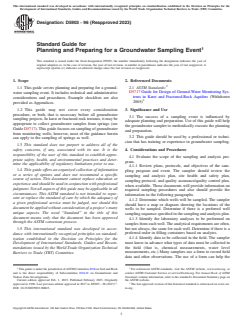 SIGNIFICANCE AND USE 3.1 The success of a sampling event is influenced by adequate planning and preparation. Use of this guide will help the groundwater sampler to methodically execute the planning and preparation. 3.2 This guide should be used by a professional or technician that has training or experience in groundwater sampling. SCOPE 1.1 This guide covers planning and preparing for a groundwater sampling event. It includes technical and administrative considerations and procedures. Example checklists are also provided as Appendices. 1.2 This guide may not cover every consideration procedure, or both, that is necessary before all groundwater sampling projects. In karst or fractured rock terranes, it may be appropriate to collect groundwater samples from springs (see Guide D5717). This guide focuses on sampling of groundwater from monitoring wells; however, most of the guidance herein can apply to the sampling of springs as well. 1.3 This standard does not purport to address all of the safety concerns, if any, associated with its use. It is the responsibility of the user of this standard to establish appropriate safety, health, and environmental practices and determine the applicability of regulatory limitations prior to use. 1.4 This guide offers an organized collection of information or a series of options and does not recommend a specific course of action. This document cannot replace education or experience and should be used in conjunction with professional judgment. Not all aspects of this guide may be applicable in all circumstances. This ASTM standard is not intended to represent or replace the standard of care by which the adequacy of a given professional service must be judged, nor should this document be applied without consideration of a project's many unique aspects. The word “Standard” in the title of this document means only that the document has been approved through the ASTM consensus process. 1.5 This international standard was developed in accordance with internationally recognized principles on standardization established in the Decision on Principles for the Development of International Standards, Guides and Recommendations issued by the World Trade Organization Technical Barriers to Trade (TBT) Committee.