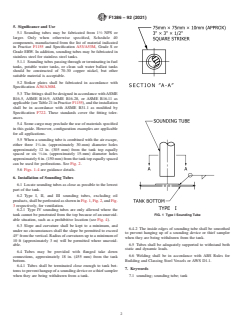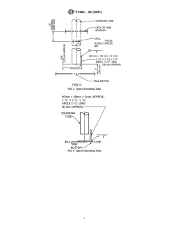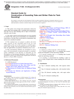 ASTM F1386-92(2021) is a guide published by ASTM International. Its full title is "Standard Guide for Construction of Sounding Tube and Striker Plate for Tank Sounding". This standard covers: SIGNIFICANCE AND USE 5.1 Sounding tubes may be fabricated from 11/2 NPS or larger. Only when otherwise specified, Schedule 40 components, manufactured from the list of material indicated in Practice F1155 and Specification A53/A53M, Grade S or Grade ERW. In addition, sounding tubes may be fabricated in stainless steel for stainless steel tanks. 5.1.1 Sounding tubes passing through or terminating in fuel tanks, potable water tanks, or clean salt water ballast tanks should be constructed of 70-30 copper nickel, but other suitable material is acceptable. 5.2 Striker plates shall be fabricated in accordance with Specification A36/A36M. 5.3 The fittings shall be designed in accordance with ASME B16.5, ASME B16.9, ASME B16.28, or ASME B16.11 as applicable (see Table 21 in Practice F1155), and the installation shall be in accordance with ASME B31.1 as modified by Specification F722. These standards cover the fitting tolerances. 5.4 Some cargo may preclude the use of materials specified in this guide. However, configuration examples are applicable for all applications. 5.5 When a sounding tube is combined with the air escape, either three 11/4-in. (approximately 30-mm) diameter holes approximately 12 in. (305 mm) from the tank top equally spaced or six 1/2-in. (approximately 15-mm) diameter holes approximately 6 in. (150 mm) from the tank top equally spaced can be used for perforations. See Fig. 2. 5.6 Figs. 1-4 are guidance details. FIG. 1 Type I Sounding Tube FIG. 2 Type II Sounding Tube FIG. 3 Type III Sounding Tube FIG. 4 Type IV Sounding Tube SCOPE 1.1 This guide covers design and construction criteria for striker plates and sounding tubes, excluding deck penetrations and caps, for use with sounding rods or tapes in freshwater, saltwater, and oil tanks. 1.2 The values stated in inch-pound units are to be regarded as standard. The values given in parentheses are mathematical conversions to SI units that are provided for information only and are not considered standard. 1.3 This standard does not purport to address all of the safety concerns, if any, associated with its use. It is the responsibility of the user of this standard to establish appropriate safety, health, and environmental practices and determine the applicability of regulatory limitations prior to use. 1.4 This international standard was developed in accordance with internationally recognized principles on standardization established in the Decision on Principles for the Development of International Standards, Guides and Recommendations issued by the World Trade Organization Technical Barriers to Trade (TBT) Committee.