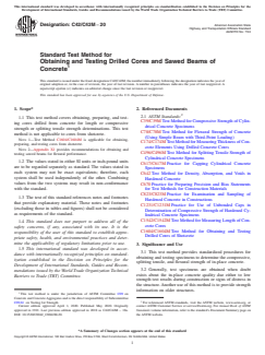 SIGNIFICANCE AND USE 3.1 This test method provides standardized procedures for obtaining and testing specimens to determine the compressive, splitting tensile, and flexural strength of in-place concrete. 3.2 Generally, test specimens are obtained when doubt exists about the in-place concrete quality due either to low strength test results during construction or signs of distress in the structure. Another use of this method is to provide strength information on older structures. 3.3 Concrete strength is affected by the location of the concrete in a structural element, with the concrete at the bottom tending to be stronger than the concrete at the top. Core strength is also affected by core orientation relative to the horizontal plane of the concrete as placed, with strength tending to be lower when measured parallel to the horizontal plane.3 These factors shall be considered in planning the locations for obtaining concrete samples and in comparing strength test results. 3.4 The strength of concrete measured by tests of cores is affected by the amount and distribution of moisture in the specimen at the time of test. There is no standard procedure to condition a specimen that will ensure that, at the time of test, it will be in the identical moisture condition as concrete in the structure. The moisture conditioning procedures in this test method are intended to provide reproducible moisture conditions that minimize within-laboratory and between-laboratory variations and to reduce the effects of moisture introduced during specimen preparation. 3.5 The measured compressive strength of a core will generally be less than that of a corresponding properly molded and cured standard cylinder tested at the same age. For a given concrete, however, there is no unique relationship between the strengths of these two types of specimens (see Note 3). The relationship is affected by many factors such as the strength level of the concrete, the in-place temperature and moisture histories, the de... SCOPE 1.1 This test method covers obtaining, preparing, and testing cores drilled from concrete for length or compressive strength or splitting tensile strength determinations. This test method is not applicable to cores from shotcrete. Note 1: Test Method C1604/C1604M is applicable for obtaining, preparing, and testing cores from shotcrete. Note 2: Appendix X1 provides recommendations for obtaining and testing sawed beams for flexural performance. 1.2 The values stated in either SI units or inch-pound units are to be regarded separately as standard. The values stated in each system may not be exact equivalents; therefore, each system shall be used independently of the other. Combining values from the two systems may result in non-conformance with the standard. 1.3 The text of this standard references notes and footnotes that provide explanatory material. These notes and footnotes (excluding those in tables and figures) shall not be considered as requirements of the standard. 1.4 This standard does not purport to address all of the safety concerns, if any, associated with its use. It is the responsibility of the user of this standard to establish appropriate safety, health, and environmental practices and determine the applicability of regulatory limitations prior to use. 1.5 This international standard was developed in accordance with internationally recognized principles on standardization established in the Decision on Principles for the Development of International Standards, Guides and Recommendations issued by the World Trade Organization Technical Barriers to Trade (TBT) Committee.