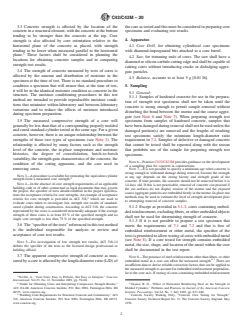 3.5 The measured compressive strength of a core will generally be less than that of a corresponding properly molded and cured standard cylinder tested at the same age. For a given concrete, however, there is no unique relationship between the strengths of these two types of specimens (see Note 3). The relationship is affected by many factors such as the strength level of the concrete, the in-place temperature and moisture histories, the de...