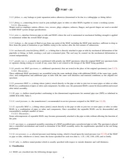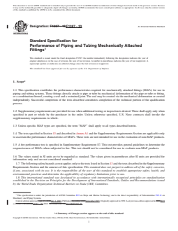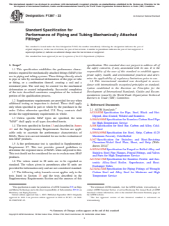 ASTM F1387-23 is a technical specification published by ASTM International. Its full title is "Standard Specification for Performance of Piping and Tubing Mechanically Attached Fittings". This standard covers: ABSTRACT This specification establishes the performance characteristics required for mechanically attached fittings (MAFs) for use in piping and tubing systems. These fittings directly attach to pipe or tube by mechanical deformation of the pipe or tube or fitting, or a combination thereof, creating a seal and a restrained joint. process. MAFs covered here are classified into the following design types: Type I—radially swaged MAF (permanent); Type II—flared MAF (separable); Type III—flareless (bite-type) MAF (separable); Type IV—grip-type MAF (separable); Type V—shape memory alloy (SMA) MAF (permanent); and Type VI—axially swaged MAF (permanent). Moreover, the MAFs shall be made from on or more of the following material grade: Grade A—carbon steel; Grade B—stainless steel; Grade C—nickel-copper; Grade D—copper-nickel; Grade E—brass; and Grade F—nickel titanium. The MAFs shall also be grouped into ten classes according to their pressure ratings. The standard qualification tests to which the MAFs shall perform satisfactorily are pneumatic proof test, hydrostatic proof test, impulse test, flexure fatigue test, tensile test, hydrostatic burst test, repeated assembly test, rotary flexure test, and mercurous nitrate test. Successful completion of the tests described constitutes completion of the technical portion of the qualification SCOPE 1.1 This specification establishes the performance characteristics required for mechanically attached fittings (MAFs) for use in piping and tubing systems. These fittings directly attach to pipe or tube by mechanical deformation of the pipe or tube or fitting, or a combination thereof, creating a seal and a restrained joint. The seal may be created via the mechanical deformation or created independently. Successful completion of the tests described constitutes completion of the technical portion of the qualification process. 1.2 Supplementary requirements are provided for use when additional testing or inspection is desired. These shall apply only when specified in part or whole by the purchaser in the order. Unless otherwise specified, U.S. Navy contracts shall invoke the supplementary requirements in whole. 1.3 Unless specific MAF types are specified, the term “MAF” shall apply to all types described herein. 1.4 The tests specified in Section 13 and described in Annex A1 and the Supplementary Requirements Section are applicable only to ascertain the performance characteristics of MAFs. These tests are not intended for use in the evaluation of non-MAF products. 1.5 A fire performance test is specified in Supplementary Requirement S7. This test provides general guidelines to determine the responsiveness of MAFs when subjected to fire. This test should not be considered for use to evaluate non-MAF products. 1.6 The values stated in SI units are to be regarded as standard. The values given in parentheses after SI units are provided for information only and are not considered standard. 1.7 The following safety hazards caveat applies only to the tests listed in Section 13 and the tests described in the Supplementary Requirements Section and the annexes of this specification: This standard does not purport to address all of the safety concerns, if any, associated with its use. It is the responsibility of the user of this standard to establish appropriate safety, health, and environmental practices and determine the applicability of regulatory limitations prior to use. 1.8 This international standard was developed in accordance with internationally recognized principles on standardization established in the Decision on Principles for the Development of International Standards, Guides and Recommendations issued by the World Trade Organization Technical Barriers to Trade (TBT) Committee.
