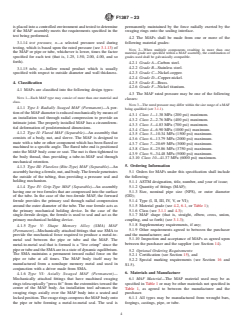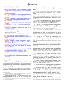 ABSTRACT This specification establishes the performance characteristics required for mechanically attached fittings (MAFs) for use in piping and tubing systems. These fittings directly attach to pipe or tube by mechanical deformation of the pipe or tube or fitting, or a combination thereof, creating a seal and a restrained joint. process. MAFs covered here are classified into the following design types: Type I—radially swaged MAF (permanent); Type II—flared MAF (separable); Type III—flareless (bite-type) MAF (separable); Type IV—grip-type MAF (separable); Type V—shape memory alloy (SMA) MAF (permanent); and Type VI—axially swaged MAF (permanent). Moreover, the MAFs shall be made from on or more of the following material grade: Grade A—carbon steel; Grade B—stainless steel; Grade C—nickel-copper; Grade D—copper-nickel; Grade E—brass; and Grade F—nickel titanium. The MAFs shall also be grouped into ten classes according to their pressure ratings. The standard qualification tests to which the MAFs shall perform satisfactorily are pneumatic proof test, hydrostatic proof test, impulse test, flexure fatigue test, tensile test, hydrostatic burst test, repeated assembly test, rotary flexure test, and mercurous nitrate test. Successful completion of the tests described constitutes completion of the technical portion of the qualification SCOPE 1.1 This specification establishes the performance characteristics required for mechanically attached fittings (MAFs) for use in piping and tubing systems. These fittings directly attach to pipe or tube by mechanical deformation of the pipe or tube or fitting, or a combination thereof, creating a seal and a restrained joint. The seal may be created via the mechanical deformation or created independently. Successful completion of the tests described constitutes completion of the technical portion of the qualification process. 1.2 Supplementary requirements are provided for use when additional testing or inspection is desired. These shall apply only when specified in part or whole by the purchaser in the order. Unless otherwise specified, U.S. Navy contracts shall invoke the supplementary requirements in whole. 1.3 Unless specific MAF types are specified, the term “MAF” shall apply to all types described herein. 1.4 The tests specified in Section 13 and described in Annex A1 and the Supplementary Requirements Section are applicable only to ascertain the performance characteristics of MAFs. These tests are not intended for use in the evaluation of non-MAF products. 1.5 A fire performance test is specified in Supplementary Requirement S7. This test provides general guidelines to determine the responsiveness of MAFs when subjected to fire. This test should not be considered for use to evaluate non-MAF products. 1.6 The values stated in SI units are to be regarded as standard. The values given in parentheses after SI units are provided for information only and are not considered standard. 1.7 The following safety hazards caveat applies only to the tests listed in Section 13 and the tests described in the Supplementary Requirements Section and the annexes of this specification: This standard does not purport to address all of the safety concerns, if any, associated with its use. It is the responsibility of the user of this standard to establish appropriate safety, health, and environmental practices and determine the applicability of regulatory limitations prior to use. 1.8 This international standard was developed in accordance with internationally recognized principles on standardization established in the Decision on Principles for the Development of International Standards, Guides and Recommendations issued by the World Trade Organization Technical Barriers to Trade (TBT) Committee.
