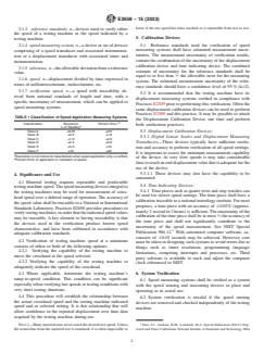 SIGNIFICANCE AND USE 4.1 Material testing requires repeatable and predictable testing machine speed. The speed measuring devices integral to the testing machines may be used for measurement of crosshead speed over a defined range of operation. The accuracy of the speed value shall be traceable to a National or International Standards Laboratory. Practices E2658 provides procedures to verify testing machines, in order that the indicated speed values may be traceable. A key element to having traceability is that the devices used in the verification produce known speed characteristics, and have been calibrated in accordance with adequate calibration standards. 4.2 Verification of testing machine speed at a minimum consists of either or both of the following options: 4.2.1 Verifying the capability of the testing machine to move the crosshead at the speed selected. 4.2.2 Verifying the capability of the testing machine to adequately indicate the speed of the crosshead. 4.3 Where applicable, determine the testing machine's ramp-to-speed condition. This condition can be significant especially when verifying fast speeds or testing conditions with very short testing durations. 4.4 This procedure will establish the relationship between the actual crosshead speed and the testing machine indicated speed and or selected setting. It is this relationship that will allow confidence in the reported displacement over time data acquired by the testing machine during use. Note 1: Many material tests never reach the desired test speed. Unless the actual data from the material test is examined, it is often impossible to know if the test speed has been reached or is repeatable from test to test. SCOPE 1.1 These practices cover procedures and requirements for the calibration and verification of testing machine speed by means of standard calibration devices. This practice is not intended to be complete purchase specifications for testing machines. 1.2 These practices apply to the verification of the speed application and measuring systems associated with the testing machine, such as a scale, dial, marked or unmarked recorder chart, digital display, setting, etc. In all cases the buyer/owner/user must designate the speed-measuring system(s) to be verified. 1.3 These practices give guidance, recommendations, and examples, specific to electro-mechanical testing machines. The practice may also be used to verify actuator speed for hydraulic testing machines. 1.4 This standard cannot be used to verify cycle counting or frequency related to cyclic fatigue testing applications. 1.5 Since conversion factors are not required in this practice, either SI units (mm/min), or English [in/min], can be used as the standard. 1.6 Speed measurement values and or settings on displays/printouts of testing machine data systems-be they instantaneous, delayed, stored, or retransmitted-which are within the Classification criteria listed in Table 1, comply with Practices E2658. 1.7 This standard does not purport to address all of the safety concerns, if any, associated with its use. It is the responsibility of the user of this standard to establish appropriate safety, health, and environmental practices and determine the applicability of regulatory limitations prior to use. 1.8 This international standard was developed in accordance with internationally recognized principles on standardization established in the Decision on Principles for the Development of International Standards, Guides and Recommendations issued by the World Trade Organization Technical Barriers to Trade (TBT) Committee.