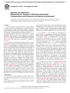 ASTM E1367-03(2023), titled Standard Test Method for Measuring the Toxicity of Sediment-Associated Contaminants with Estuarine and Marine Invertebrates, establishes laboratory procedures for evaluating the toxicity of contaminants present in whole sediments. Developed by ASTM International, this standard is a key resource for environmental assessment, sediment quality monitoring, and ecological risk management in aquatic environments. By focusing on both acute and chronic effects on estuarine and marine invertebrates-particularly amphipods-this method provides critical data for environmental scientists, regulators, and industry professionals concerned with sediment contamination.