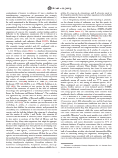 ASTM E1367-03(2023) is a standard published by ASTM International. Its full title is "Standard Test Method for Measuring the Toxicity of Sediment-Associated Contaminants with Estuarine and Marine Invertebrates". This standard covers: SIGNIFICANCE AND USE 5.1 General: 5.1.1 Sediment provides habitat for many aquatic organisms and is a major repository for many of the more persistent chemicals that are introduced into surface waters. In the aquatic environment, most anthropogenic chemicals and waste materials including toxic organic and inorganic chemicals eventually accumulate in sediment. Mounting evidences exists of environmental degradation in areas where USEPA Water Quality Criteria (WQC; Stephan et al.(66)) are not exceeded, yet organisms in or near sediments are adversely affected Chapman, 1989 (67). The WQC were developed to protect organisms in the water column and were not directed toward protecting organisms in sediment. Concentrations of contaminants in sediment may be several orders of magnitude higher than in the overlying water; however, whole sediment concentrations have not been strongly correlated to bioavailability Burton, 1991 (68). Partitioning or sorption of a compound between water and sediment may depend on many factors including: aqueous solubility, pH, redox, affinity for sediment organic carbon and dissolved organic carbon, grain size of the sediment, sediment mineral constituents (oxides of iron, manganese, and aluminum), and the quantity of acid volatile sulfides in sediment Di Toro et al. 1991(69) Giesy et al. 1988 (70). Although certain chemicals are highly sorbed to sediment, these compounds may still be available to the biota. Chemicals in sediments may be directly toxic to aquatic life or can be a source of chemicals for bioaccumulation in the food chain. 5.1.2 The objective of a sediment test is to determine whether chemicals in sediment are harmful to or are bioaccumulated by benthic organisms. The tests can be used to measure interactive toxic effects of complex chemical mixtures in sediment. Furthermore, knowledge of specific pathways of interactions among sediments and test organisms is not necessary to conduct the tests Kemp et al. 1988, (71). Sediment tests can be used ... SCOPE 1.1 This test method covers procedures for testing estuarine or marine organisms in the laboratory to evaluate the toxicity of contaminants associated with whole sediments. Sediments may be collected from the field or spiked with compounds in the laboratory. General guidance is presented in Sections 1 – 15 for conducting sediment toxicity tests with estuarine or marine amphipods. Specific guidance for conducting 10-d sediment toxicity tests with estuarine or marine amphipods is outlined in Annex A1 and specific guidance for conducting 28-d sediment toxicity tests with Leptocheirus plumulosus is outlined in Annex A2. 1.2 Procedures are described for testing estuarine or marine amphipod crustaceans in 10-d laboratory exposures to evaluate the toxicity of contaminants associated with whole sediments (Annex A1; USEPA 1994a (1)). Sediments may be collected from the field or spiked with compounds in the laboratory. A toxicity method is outlined for four species of estuarine or marine sediment-burrowing amphipods found within United States coastal waters. The species are Ampelisca abdita, a marine species that inhabits marine and mesohaline portions of the Atlantic coast, the Gulf of Mexico, and San Francisco Bay; Eohaustorius estuarius, a Pacific coast estuarine species; Leptocheirus plumulosus, an Atlantic coast estuarine species; and Rhepoxynius abronius , a Pacific coast marine species. Generally, the method described may be applied to all four species, although acclimation procedures and some test conditions (that is, temperature and salinity) will be species-specific (Sections 12 and Annex A1). The toxicity test is conducted in 1-L glass chambers containing 175 mL of sediment and 775 mL of overlying seawater. Exposure is static (that is, water is not renewed), and the animals are not fed over the 10-d exposure period. The endpoint in the toxicity test is survival with reburial of surviving amphipods as an additional m...