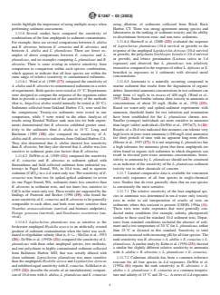 SIGNIFICANCE AND USE 5.1 General: 5.1.1 Sediment provides habitat for many aquatic organisms and is a major repository for many of the more persistent chemicals that are introduced into surface waters. In the aquatic environment, most anthropogenic chemicals and waste materials including toxic organic and inorganic chemicals eventually accumulate in sediment. Mounting evidences exists of environmental degradation in areas where USEPA Water Quality Criteria (WQC; Stephan et al.(66)) are not exceeded, yet organisms in or near sediments are adversely affected Chapman, 1989 (67). The WQC were developed to protect organisms in the water column and were not directed toward protecting organisms in sediment. Concentrations of contaminants in sediment may be several orders of magnitude higher than in the overlying water; however, whole sediment concentrations have not been strongly correlated to bioavailability Burton, 1991 (68). Partitioning or sorption of a compound between water and sediment may depend on many factors including: aqueous solubility, pH, redox, affinity for sediment organic carbon and dissolved organic carbon, grain size of the sediment, sediment mineral constituents (oxides of iron, manganese, and aluminum), and the quantity of acid volatile sulfides in sediment Di Toro et al. 1991(69) Giesy et al. 1988 (70). Although certain chemicals are highly sorbed to sediment, these compounds may still be available to the biota. Chemicals in sediments may be directly toxic to aquatic life or can be a source of chemicals for bioaccumulation in the food chain. 5.1.2 The objective of a sediment test is to determine whether chemicals in sediment are harmful to or are bioaccumulated by benthic organisms. The tests can be used to measure interactive toxic effects of complex chemical mixtures in sediment. Furthermore, knowledge of specific pathways of interactions among sediments and test organisms is not necessary to conduct the tests Kemp et al. 1988, (71). Sediment tests can be used ... SCOPE 1.1 This test method covers procedures for testing estuarine or marine organisms in the laboratory to evaluate the toxicity of contaminants associated with whole sediments. Sediments may be collected from the field or spiked with compounds in the laboratory. General guidance is presented in Sections 1 – 15 for conducting sediment toxicity tests with estuarine or marine amphipods. Specific guidance for conducting 10-d sediment toxicity tests with estuarine or marine amphipods is outlined in Annex A1 and specific guidance for conducting 28-d sediment toxicity tests with Leptocheirus plumulosus is outlined in Annex A2. 1.2 Procedures are described for testing estuarine or marine amphipod crustaceans in 10-d laboratory exposures to evaluate the toxicity of contaminants associated with whole sediments (Annex A1; USEPA 1994a (1)). Sediments may be collected from the field or spiked with compounds in the laboratory. A toxicity method is outlined for four species of estuarine or marine sediment-burrowing amphipods found within United States coastal waters. The species are Ampelisca abdita, a marine species that inhabits marine and mesohaline portions of the Atlantic coast, the Gulf of Mexico, and San Francisco Bay; Eohaustorius estuarius, a Pacific coast estuarine species; Leptocheirus plumulosus, an Atlantic coast estuarine species; and Rhepoxynius abronius , a Pacific coast marine species. Generally, the method described may be applied to all four species, although acclimation procedures and some test conditions (that is, temperature and salinity) will be species-specific (Sections 12 and Annex A1). The toxicity test is conducted in 1-L glass chambers containing 175 mL of sediment and 775 mL of overlying seawater. Exposure is static (that is, water is not renewed), and the animals are not fed over the 10-d exposure period. The endpoint in the toxicity test is survival with reburial of surviving amphipods as an additional m...