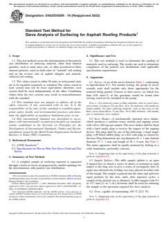 SIGNIFICANCE AND USE 4.1 This test method is used to determine the grading of materials used as surfacing. The results are used to determine compliance of the particle size distribution with applicable specification requirements. SCOPE 1.1 This test method covers the determination of the particle size distribution of surfacing material, other than mineral granules, such as sand, mica, talc, or other powdered or flaky mineral particles, used on both sides of “smooth” roll roofing and on the reverse side of asphalt shingles and mineral-surfaced roll roofing. 1.2 The values stated in either SI units or inch-pound units are to be regarded separately as standard. The values stated in each system may not be exact equivalents; therefore, each system shall be used independently of the other. Combining values from the two systems may result in nonconformance with the standard. 1.3 This standard does not purport to address all of the safety concerns, if any, associated with its use. It is the responsibility of the user of this standard to establish appropriate safety, health, and environmental practices and determine the applicability of regulatory limitations prior to use. 1.4 This international standard was developed in accordance with internationally recognized principles on standardization established in the Decision on Principles for the Development of International Standards, Guides and Recommendations issued by the World Trade Organization Technical Barriers to Trade (TBT) Committee.