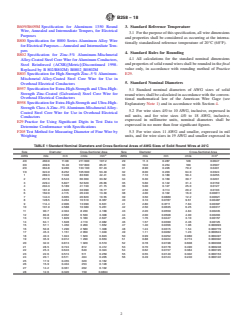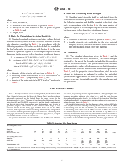 ABSTRACT This specification prescribes the standard nominal diameters and cross-sectional areas of American Wire Gage (AWG) sizes of solid round wires, used as electrical conductors, and gives equations and rules for the calculation of standard nominal mass and lengths, resistances, and breaking or rated strengths of such wires. All wire dimensions and properties shall be considered as occurring at the internationally standardized reference temperature and all calculations shall be rounded in the final value only. SCOPE 1.1 This specification prescribes standard nominal diameters and cross-sectional areas of American Wire Gage (AWG) sizes of solid round wires, used as electrical conductors, and gives equations and rules for the calculation of standard nominal mass and lengths, resistances, and breaking strengths of such wires (Explanatory Note 1). 1.2 The values stated in inch-pound or SI units are to be regarded separately as standard. Each system shall be used independently of the other. Combining values of the two systems may result in nonconformance with the specification. For conductor sizes designated by AWG or kcmil sizes, the requirements in SI units have been numerically converted from the corresponding values stated or derived, in inch-pound units. For conductor sizes designated by SI units only, the requirements are stated or derived in SI units. 1.2.1 For density, resistivity and temperature, the values stated in SI units are to be regarded as standard. 1.3 This international standard was developed in accordance with internationally recognized principles on standardization established in the Decision on Principles for the Development of International Standards, Guides and Recommendations issued by the World Trade Organization Technical Barriers to Trade (TBT) Committee.