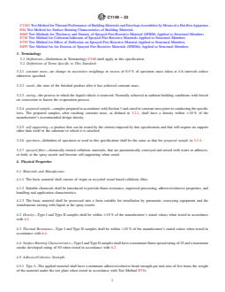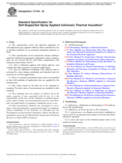ASTM C1149-23 is a technical specification published by ASTM International. Its full title is "Standard Specification for Self-Supported Spray Applied Cellulosic Thermal Insulation". This standard covers: ABSTRACT This specification covers self-supported spray applied cellulosic thermal insulation for use as thermal insulation or acoustical absorbent material, or both. The chemically-treated cellulosic materials that are also covered in this specification are used for pneumatic applications operating within a specific temperature range. The materials are classified into two types based on the type of adhesive used and exposure of the application. Specimens for testing should be prepared and tested using the prescribed methods and should conform to the specified values of density, thermal resistance, surface bonding characteristics, adhesive strength, cohesive strength, smoldering combustion, fungi resistance, corrosion, moisture vapor absorption, odor, flame resistance permanency, substrate deflection, and air erosion. SCOPE 1.1 The specification covers the physical properties of self-supported spray applied cellulosic fibers intended for use as thermal insulation or an acoustical absorbent material, or both. 1.2 This specification covers chemically treated cellulosic materials intended for pneumatic applications where temperatures do not exceed 82.2°C and where temperatures will routinely remain below 65.6°C. 1.2.1 Type I—Material applied with liquid adhesive and suitable for either exposed or enclosed applications. 1.2.2 Type II—Materials containing a dry adhesive that is activated by water during installation and intended only for enclosed or covered applications. 1.3 This is a material specification only and is not intended to deal with methods of application that are supplied by the manufacturer. 1.4 The values stated in SI units are to be regarded as standard. No other units of measurement are included in this standard. 1.5 This standard does not purport to address all of the safety concerns, if any, associated with its use. It is the responsibility of the user of this standard to establish appropriate safety, health, and environmental practices and determine the applicability of regulatory limitations prior to use. 1.6 This international standard was developed in accordance with internationally recognized principles on standardization established in the Decision on Principles for the Development of International Standards, Guides and Recommendations issued by the World Trade Organization Technical Barriers to Trade (TBT) Committee.