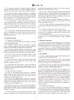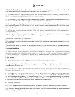 ABSTRACT This specification covers self-supported spray applied cellulosic thermal insulation for use as thermal insulation or acoustical absorbent material, or both. The chemically-treated cellulosic materials that are also covered in this specification are used for pneumatic applications operating within a specific temperature range. The materials are classified into two types based on the type of adhesive used and exposure of the application. Specimens for testing should be prepared and tested using the prescribed methods and should conform to the specified values of density, thermal resistance, surface bonding characteristics, adhesive strength, cohesive strength, smoldering combustion, fungi resistance, corrosion, moisture vapor absorption, odor, flame resistance permanency, substrate deflection, and air erosion. SCOPE 1.1 The specification covers the physical properties of self-supported spray applied cellulosic fibers intended for use as thermal insulation or an acoustical absorbent material, or both. 1.2 This specification covers chemically treated cellulosic materials intended for pneumatic applications where temperatures do not exceed 82.2°C and where temperatures will routinely remain below 65.6°C. 1.2.1 Type I—Material applied with liquid adhesive and suitable for either exposed or enclosed applications. 1.2.2 Type II—Materials containing a dry adhesive that is activated by water during installation and intended only for enclosed or covered applications. 1.3 This is a material specification only and is not intended to deal with methods of application that are supplied by the manufacturer. 1.4 The values stated in SI units are to be regarded as standard. No other units of measurement are included in this standard. 1.5 This standard does not purport to address all of the safety concerns, if any, associated with its use. It is the responsibility of the user of this standard to establish appropriate safety, health, and environmental practices and determine the applicability of regulatory limitations prior to use. 1.6 This international standard was developed in accordance with internationally recognized principles on standardization established in the Decision on Principles for the Development of International Standards, Guides and Recommendations issued by the World Trade Organization Technical Barriers to Trade (TBT) Committee.