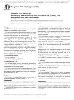 ASTM F888-06(2024), titled Standard Test Method for Measuring Maximum Functional Volume of the Primary Dirt Receptacle in a Vacuum Cleaner, sets out an internationally recognized procedure for determining the maximum functional capacity of the primary dirt receptacle in household vacuum cleaners. Issued by ASTM International, this standard outlines a consistent approach for evaluating vacuum cleaner dirt receptacle volume to support product comparability and performance validation.