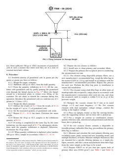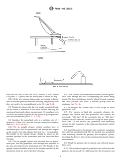 SIGNIFICANCE AND USE 3.1 This test method covers a procedure to determine the maximum functional volume of the primary dirt receptacle when installed in the vacuum cleaner. 3.2 This test method provides the maximum amount of test media that the primary dirt receptacle will hold and may be more than the volume obtained when filled to the manufacturer's recommended fill line. SCOPE 1.1 This test method covers household types of upright, canister, and combination vacuum cleaners. 1.2 This test method provides a measurement in dry quarts or litres of the maximum functional volume of the primary dirt receptacle when installed in the vacuum cleaner. 1.3 This standard does not purport to address all of the safety concerns, if any, associated with its use. It is the responsibility of the user of this standard to establish appropriate safety, health, and environmental practices and determine the applicability of regulatory limitations prior to use. For specific hazards statements see 7.2 and 8.5. 1.4 This international standard was developed in accordance with internationally recognized principles on standardization established in the Decision on Principles for the Development of International Standards, Guides and Recommendations issued by the World Trade Organization Technical Barriers to Trade (TBT) Committee.