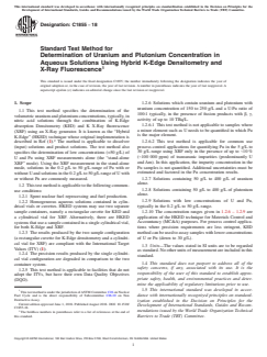 ASTM C1855-18 is an international standard developed by ASTM for determining uranium and plutonium concentrations in aqueous solutions using the Hybrid K-Edge Densitometry (HKED) and X-Ray Fluorescence (XRF) techniques. This test method is applicable primarily to nitric acid solutions of nuclear materials, allowing precise, element-specific measurement of actinide concentrations. The standard ensures robust quality control and measurement accuracy for nuclear applications, such as nuclear fuel reprocessing and fuel fabrication facilities.