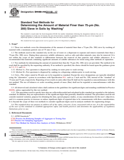 1.1 These test methods cover the determination of the amount of material finer than a 75-μm (No. 200) sieve by washing of material with a maximum particle size of 75 mm (3 in.).