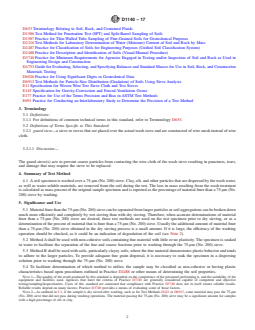 SIGNIFICANCE AND USE 5.1 Material finer than the 75-μm (No. 200) sieve can be separated from larger particles or soil aggregations can be broken down much more efficiently and completely by wet sieving than with dry sieving. Therefore, when accurate determinations of material finer than a 75-μm (No. 200) sieve are desired, these test methods are used on the test specimen prior to dry sieving, or as a determination of the percent of material that is finer than a 75-μm (No. 200) sieve. Usually the additional amount of material finer than a 75-μm (No. 200) sieve obtained in the dry sieving process is a small amount. If it is large, the efficiency of the washing operation should be checked, as it could be an indication of degradation of the soil (see Note 2). 5.2 Method A shall be used with non-cohesive soils containing fine material with little or no plasticity. The specimen is soaked in water to facilitate the separation of the fine and coarse fractions prior to washing through the 75-μm (No. 200) sieve. 5.3 Method B shall be used with soils, particularly clayey soils, where the fine material demonstrates plastic behavior and tends to adhere to the larger particles. To provide adequate fine grain dispersal, it is necessary to soak the specimen in a dispersing solution prior to washing through the 75-μm (No. 200) sieve. 5.4 To facilitate determination of which method to utilize, the sample may be classified as non-cohesive or having plastic characteristics based upon procedures outlined in Practice D2488 or other means of determining the soil properties. Note 1: The quality of the result produced by this standard is dependent on the competence of the personnel performing it, and the suitability of the equipment and facilities used. Agencies that meet the criteria of Practice D3740 are generally considered capable of competent and objective testing/sampling/inspection/etc. Users of this standard are cautioned that compliance with Practice D3740 does not in itself ensure reliable ... SCOPE 1.1 These test methods cover the determination of the amount of material finer than a 75-μm (No. 200) sieve by washing of material with a maximum particle size of 75 mm (3 in.). 1.2 The methods used in this standard rely on the use of water or a dispersant to separate and remove materials finer than a 75-μm (No. 200) sieve. During these processes soluble substances, such as salts and other minerals, may also be removed. It is not within the scope of this standard to differentiate between the removal of fine particles and soluble substances. It is recommended that materials containing significant amounts of soluble substances be tested using other methods of separation. 1.3 Two methods for determining the amount of material finer than the 75-μm (No. 200) sieve are provided. The method to be used shall be specified by the requesting authority. If no method is specified, the choice should be based upon the guidance given in 5.2, 5.3, and 5.4. 1.3.1 Method A—Test specimen is dispersed by soaking in water prior to wash sieving. 1.3.2 Method B—Test specimen is dispersed by soaking in a dispersing solution prior to wash sieving. 1.4 Units—The values stated in SI units are to be regarded as standard. Except the sieve designations are typically identified using the “alternative” system in accordance with Specification E11, such as 3 inch and No. 200, instead of the “standard” of 75-mm and 75-μm, respectively. Reporting of test results in units other than SI shall not be regarded as nonconformance with this test method. The use of balances or scales recording pounds of mass (lbm) shall not be regarded as nonconformance with this standard. 1.5 All observed and calculated values shall conform to the guidelines for significant digits and rounding established in Practice D6026, unless superseded by this test method. 1.5.1 The procedures used to specify how data are collected/recorded and calculated in this standa...