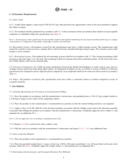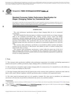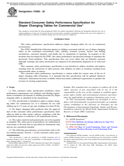 ASTM F2285-22: Standard Consumer Safety Performance Specification for Diaper Changing Tables for Commercial Use sets forth comprehensive safety and performance requirements for diaper changing tables designed for commercial settings. Developed by ASTM International, this standard is specifically targeted at reducing hazards associated with diaper changing tables for children up to 3.5 years old and weighing less than 50 lbs. The document establishes key testing procedures, labeling requirements, and guidance to minimize risks including falls, injury from restraint systems, entrapment, and stability issues.