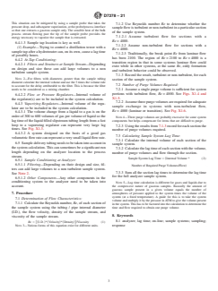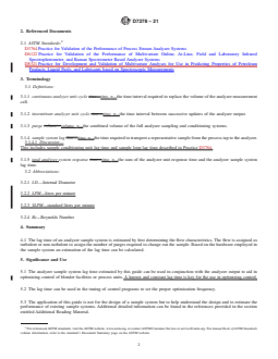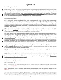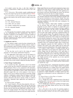 SIGNIFICANCE AND USE 5.1 The analyzer sample system lag time estimated by this guide can be used in conjunction with the analyzer output to aid in optimizing control of blender facilities or process units. A known and constant lag time is key for the use in optimizing control. 5.2 The lag time can be used in the tuning of control programs to set the proper optimization frequency. 5.3 The application of this guide is not for the design of a sample system but to help understand the design and to estimate the performance of existing sample systems. Additional detailed information can be found in the references provided in the section entitled Additional Reading Material. SCOPE 1.1 This guide covers the application of routine calculations to estimate sample system lag time, in seconds, for gas, liquid, and mixed phase systems. 1.2 This guide considers the sources of lag time from the process sample tap, tap conditioning, sample transport, pre-analysis conditioning and analysis. 1.3 Lag times are estimated based on a prediction of flow characteristics, turbulent, non turbulent, or laminar, and the corresponding purge requirements. 1.4 Mixed phase systems prevent reliable representative sampling so system lag times should not be used to predict sample representation of a mixed phase stream. 1.5 The values stated in inch-pound units are to be regarded as standard. Other units of measurement are included in this standard and Appendix X1 examples where normally seen in industry. 1.6 This standard does not purport to address all of the safety concerns, if any, associated with its use. It is the responsibility of the user of this standard to establish appropriate safety, health, and environmental practices and determine the applicability of regulatory limitations prior to use. 1.7 This international standard was developed in accordance with internationally recognized principles on standardization established in the Decision on Principles for the Development of International Standards, Guides and Recommendations issued by the World Trade Organization Technical Barriers to Trade (TBT) Committee.
