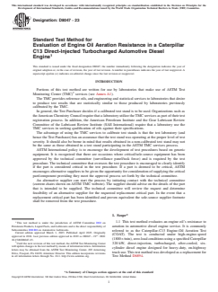 1.1 This test method evaluates an engine oil's resistance to aeration in automotive diesel engine service. It is commonly referred to as the Caterpillar-C13 Engine-Oil Aeration Test (COAT). The test is conducted under high-engine-speed (1800 r/min), zero-load conditions using a specified Caterpillar 320 kW, direct-injection, turbocharged, after-cooled, six-cylinder diesel engine designed for heavy-duty, on-highway truck use. This test method was developed as a replacement for Test Method D6894.