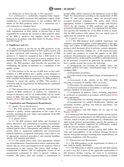 SIGNIFICANCE AND USE 4.1 This practice is for the use by RM producers in the development and implementation of their quality system and by those concerned with assessing the competence of RM producers. It should be recognized that a RM needs to be characterized mainly to the level of accuracy required for its intended purpose (that is, appropriate measurement uncertainty). The RM producer shall describe the procedure for establishing the quality of materials as a component of the quality system. 4.2 This practice is for the use of RM users in the establishment if a RM producer has a quality system adequate to produce high quality RMs. It can be used by users to determine if the scientific and technical competence of a RMs producer is adequate to ensure the quality of RMs. This practice is consistent with the requirements for RM producers established in ISO Guide 34. 4.3 This practice does not specify specific protocols for the contents of RMs certificates of analysis, for calibration in analytical chemistry and use of certified RMs and for certification of RMs. For this information, users are referred to Practice D6362, ISO Guide 32, and ISO Guide 35. SCOPE 1.1 This practice establishes the general requirements with which a reference materials (RM) producer has to demonstrate that it operates, if it is to be recognized as competent to produce RMs used for water analysis. 1.2 This practice establishes the quality system requirements in accordance with which waters RMs shall be produced. It is intended to be used as part of a RM producer’s general quality assurance (QA) procedures. RM producers shall define their scope in terms of the application, the measurement methods used in the homogeneity, stability, and characterization studies. 1.3 The values stated in SI units are to be regarded as standard. No other units of measurement are included in this standard. 1.4 This standard does not purport to address all of the safety concerns, if any, associated with its use. It is the responsibility of the user of this standard to establish appropriate safety, health, and environmental practices and determine the applicability of regulatory limitations prior to use. 1.5 This international standard was developed in accordance with internationally recognized principles on standardization established in the Decision on Principles for the Development of International Standards, Guides and Recommendations issued by the World Trade Organization Technical Barriers to Trade (TBT) Committee.