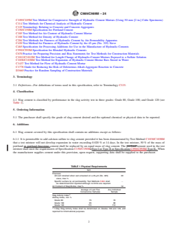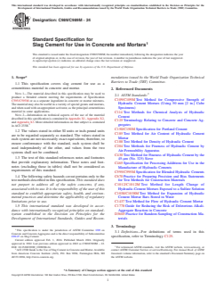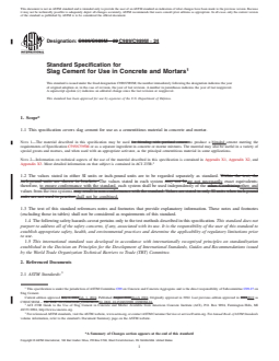 ASTM C989/C989M-24 is a technical specification published by ASTM International. Its full title is "Standard Specification for Slag Cement for Use in Concrete and Mortars". This standard covers: ABSTRACT This specification covers three strength grades of finely ground granulated blast-furnace slag (Grades 80, 100, and 120) for use as a cementitious material in concrete and mortars. The slag shall contain no additions and shall conform to the sulfide sulfur and sulfate chemical composition requirement. Physical properties of the slag shall be in accordance with the requirements for fineness as determined by air permeability and air content, slag activity index, and compressive strength. SCOPE 1.1 This specification covers slag cement for use as a cementitious material in concrete and mortar. Note 1: The material described in this specification may be used to produce a blended cement meeting the requirements of Specification C595/C595M or as a separate ingredient in concrete or mortar mixtures. The material may also be useful in a variety of special grouts and mortars, and when used with an appropriate activator, as the principal cementitious material in some applications. Note 2: Information on technical aspects of the use of the material described in this specification is contained in Appendix X1, Appendix X2, and Appendix X3. More detailed information on that subject is contained in ACI 233R.2 1.2 The values stated in either SI units or inch-pound units are to be regarded separately as standard. The values stated in each system are not necessarily exact equivalents; therefore, to ensure conformance with the standard, each system shall be used independently of the other, and values from the two systems shall not be combined. 1.3 The text of this standard references notes and footnotes that provide explanatory information. These notes and footnotes (excluding those in tables) shall not be considered as requirements of this standard. 1.4 The following safety hazards caveat pertains only to the test methods described in this specification. This standard does not purport to address all of the safety concerns, if any, associated with its use. It is the responsibility of the user of this standard to establish appropriate safety, health, and environmental practices and determine the applicability of regulatory limitations prior to use. 1.5 This international standard was developed in accordance with internationally recognized principles on standardization established in the Decision on Principles for the Development of International Standards, Guides and Recommendations issued by the World Trade Organization Technical Barriers to Trade (TBT) Committee.