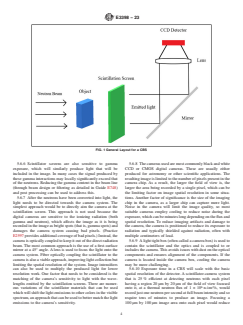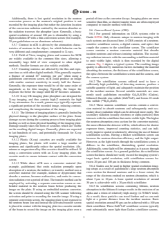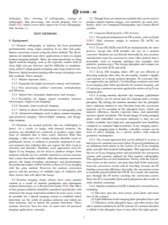 SIGNIFICANCE AND USE 4.1 Purpose—Practices to be employed for the radiographic examination of materials and components with neutrons using digital neutron detectors are outlined herein. They are intended as a guide for the assessment of a digital neutron radiograph’s characteristics. For information on neutron beam lines for imaging and film neutron radiography, refer to Guide E748. 4.2 Limitations—Acceptance standards have not been established for any material or production process. Neutron radiography, whether performed by means of a reactor, an accelerator, subcritical assembly, or radioactive source, will be consistent in sensitivity and spatial resolution only if the consistency of all details of the technique, such as neutron source, collimation, geometry, imaging system, etc., are maintained. This guide is limited to the use of digital neutron detectors in combination with neutron conversion materials for image recording. This guide is intended for use with thermal and cold neutron spectrums. The production of thermal neutron radiographs by employing the use of film and appropriate conversion screens is covered in Guide E748. 4.3 Interpretation and Acceptance Standards—Interpretat- ion and acceptance standards are not covered by this guide. Designation of accept-reject standards is recognized to be within the cognizance of product specifications. 4.4 Other Aspects of the Neutron Radiographic Process—For many important aspects of neutron radiography such as technique, files, viewing of radiographs, storage of radiographs, film processing, and record keeping, refer to Guide E94, which covers these aspects for X-ray radiography. (See Section 2.) SCOPE 1.1 This guide covers the evaluation, qualification, and quantification of digital neutron images. These images can be acquired by many methods, including: neutron sensitive imaging plates (Computed Radiography – CR), Digital Detector Arrays – DDA’s (amorphous silicon, CMOS, CCD, etc.), micro-channel plates, neutron sensitive fluoroscopes, neutron sensitive scintillators coupled to optical cameras, digitized radiographic films, and linear diode arrays. 1.2 This guide does not purport to establish what is considered an acceptable image but is intended to only give guidance on digital neutron imaging, as well as image quality metrics of importance, and how they can be measured and reported. 1.3 The values stated in SI units are to be regarded as standard. No other units of measurement are included in this standard. 1.4 This standard does not purport to address all of the safety concerns, if any, associated with its use. It is the responsibility of the user of this standard to establish appropriate safety, health, and environmental practices and determine the applicability of regulatory limitations prior to use. 1.5 This international standard was developed in accordance with internationally recognized principles on standardization established in the Decision on Principles for the Development of International Standards, Guides and Recommendations issued by the World Trade Organization Technical Barriers to Trade (TBT) Committee.