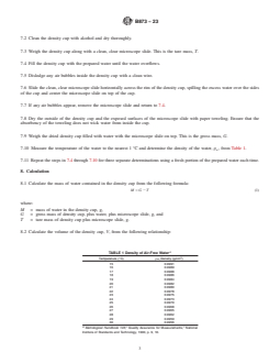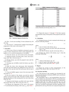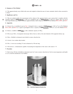 - Apparent Density Cup Volume Measurement: The standard details a procedure to measure the volume of cylindrical (25.00 cm³ ± 0.03 cm³) and square (16.39 cm³ ± 0.05 cm³) apparent density cups.